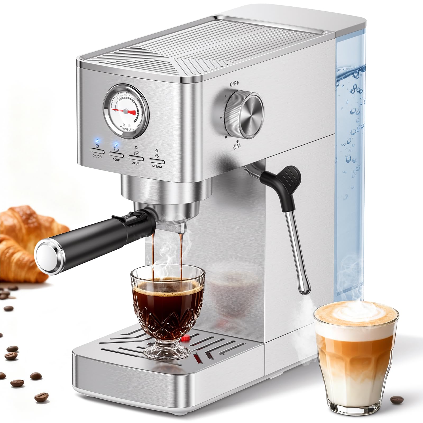 MAVIOR Espresso Machine, 20 Bar Visible High Pressure Gauge, 47 OZ Water Tank with Milk Frorther Silver, Automatic Stainless Steel Espresso Maker, Gift for Coffee Machine Enthusiasts