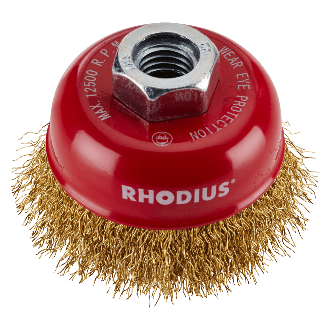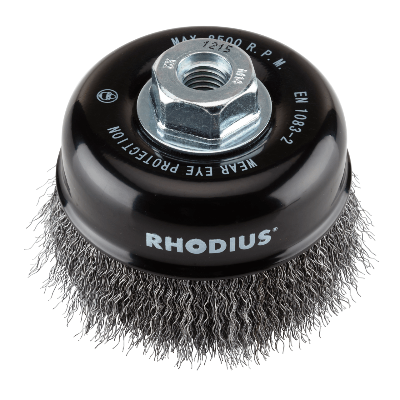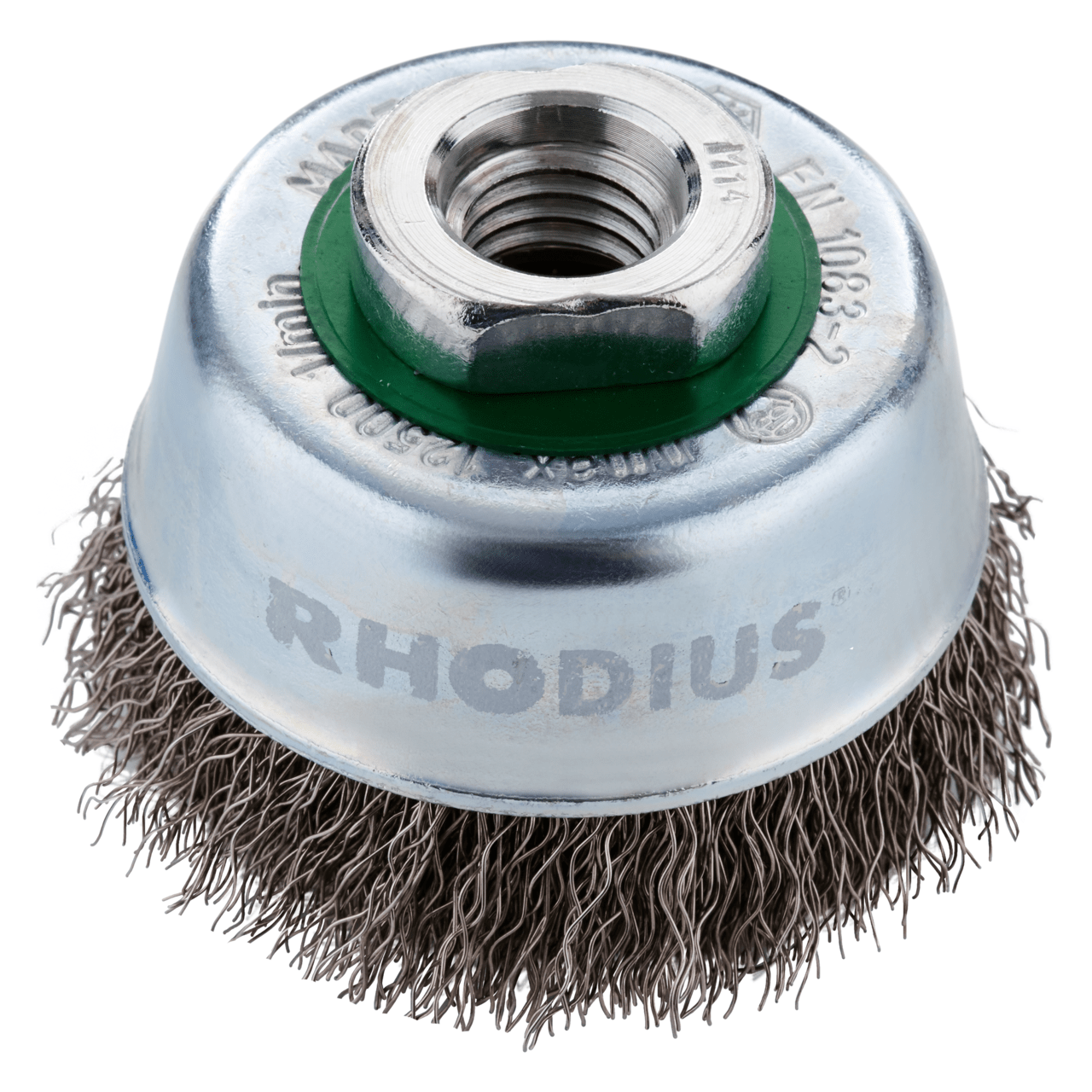 Características: Rhodius Pop Brush de alta calidad ETBZ Ø 65 mm para el procesamiento profesional de metales. Cepillo de acero robusto con cerdas de alambre eficientes para eliminar el óxido, el color y la contaminación