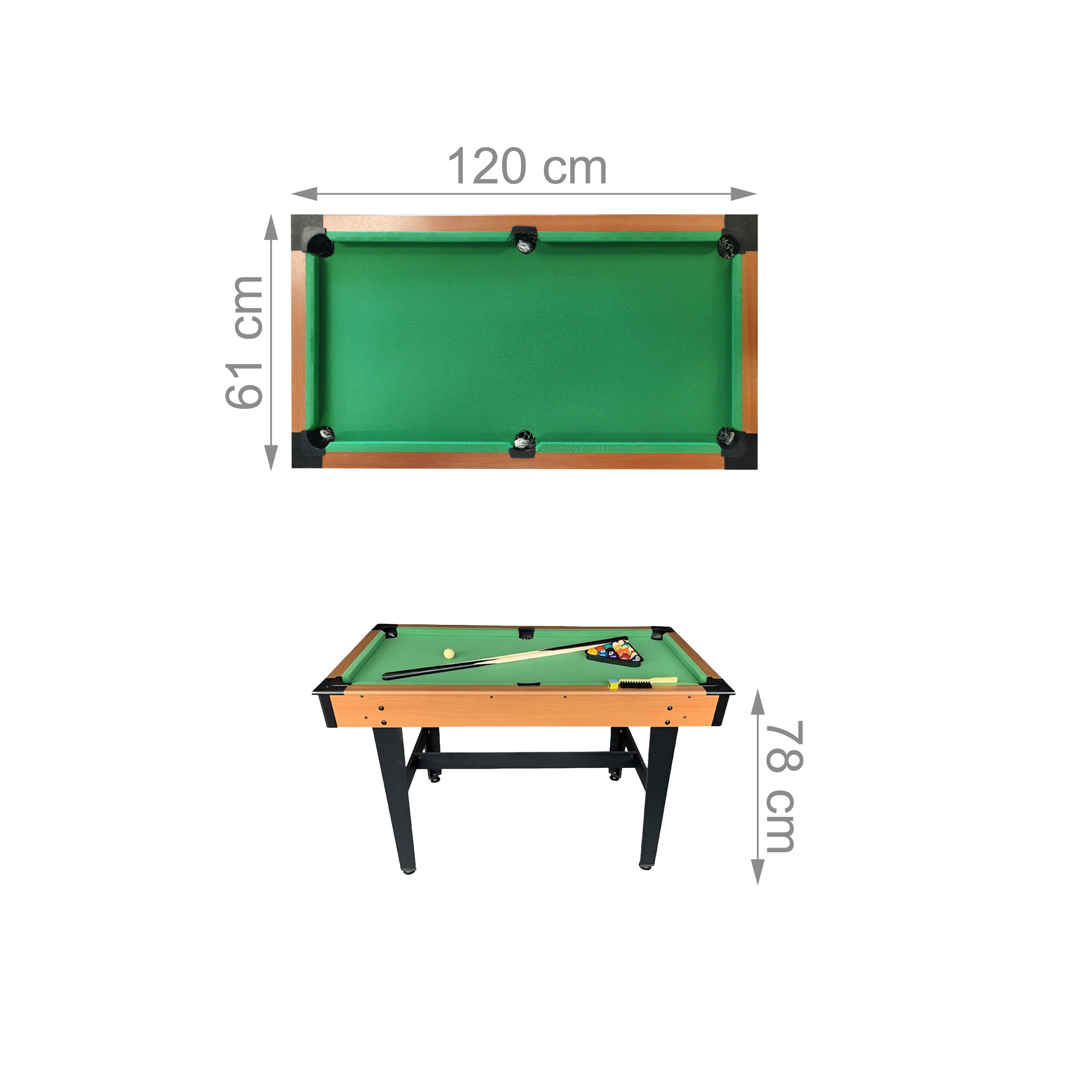 - Details: 4 Fuß Poolbillardtisch - Größe H x B x T: ca. 78 x 120 x 61 cm - Länge je Queue: ca. 90 cm