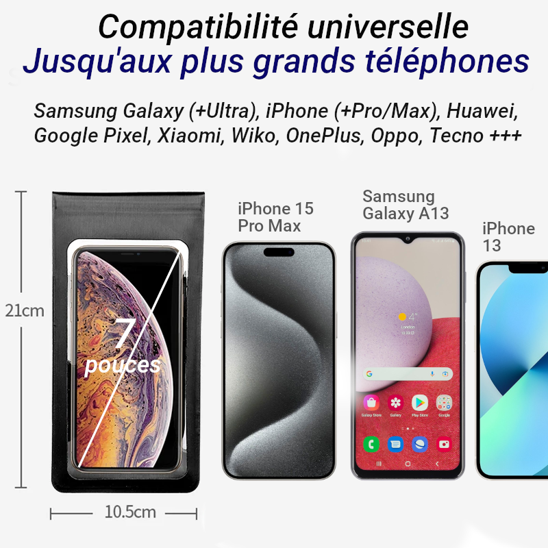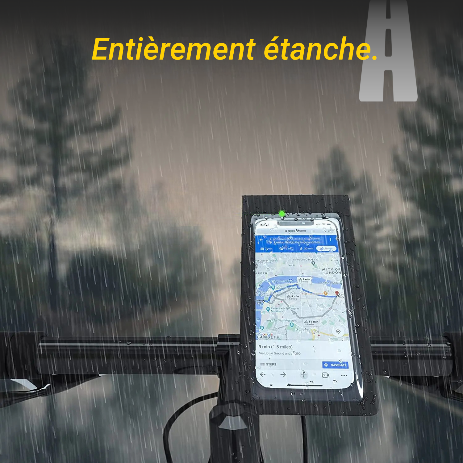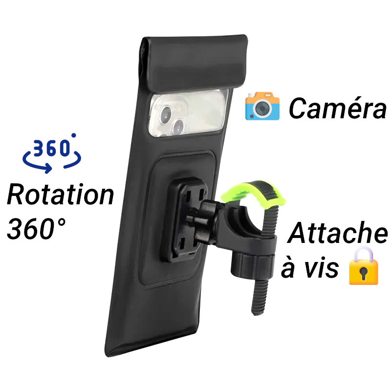 S'accroche sur une barre de diamètre 2 à 6 cmLa pochette est entièrement étancheL'attache est en plastique avec un écrou pour serrerLe téléphone est orientable dans toutes les directions avec un écrou pour serrer