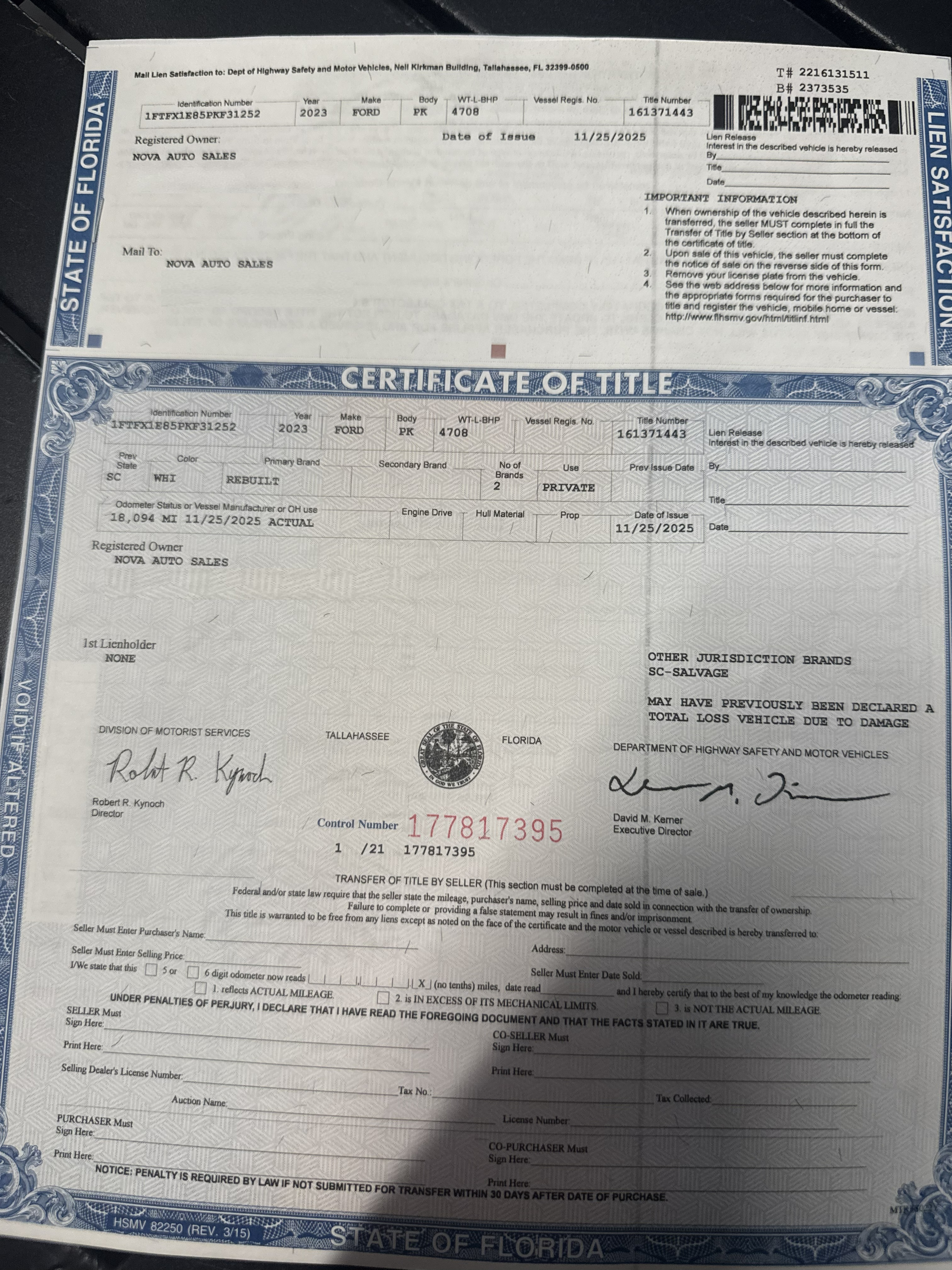 | Vin#:1FTFX1E85PKF31252 Rebuilt Title (view title) | Mileage: 18,094 |