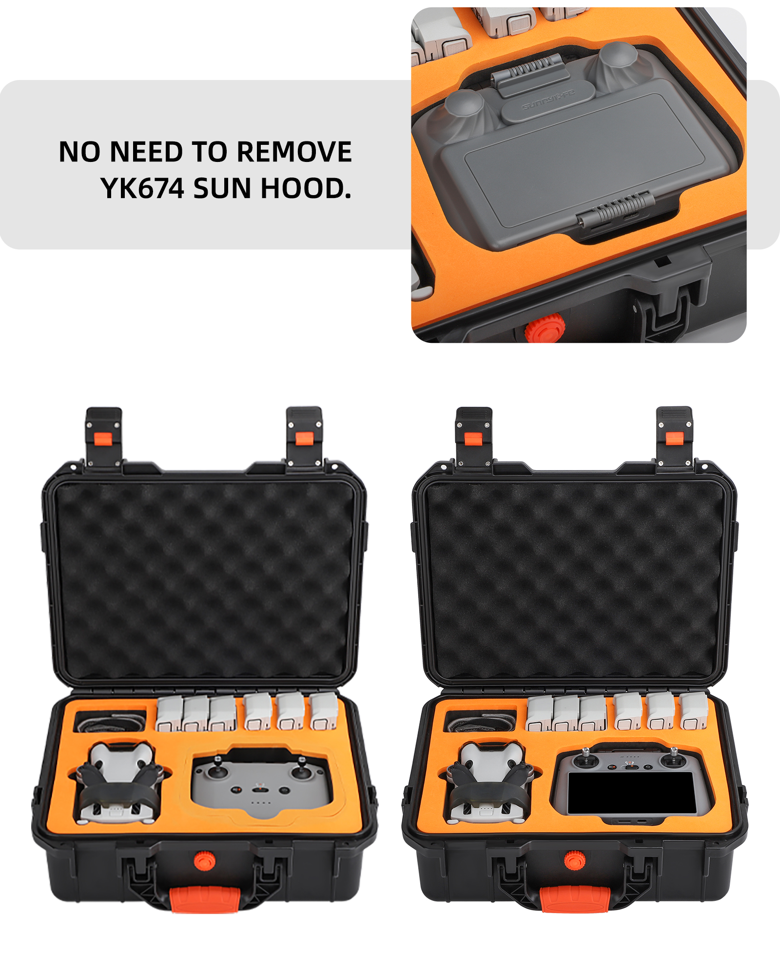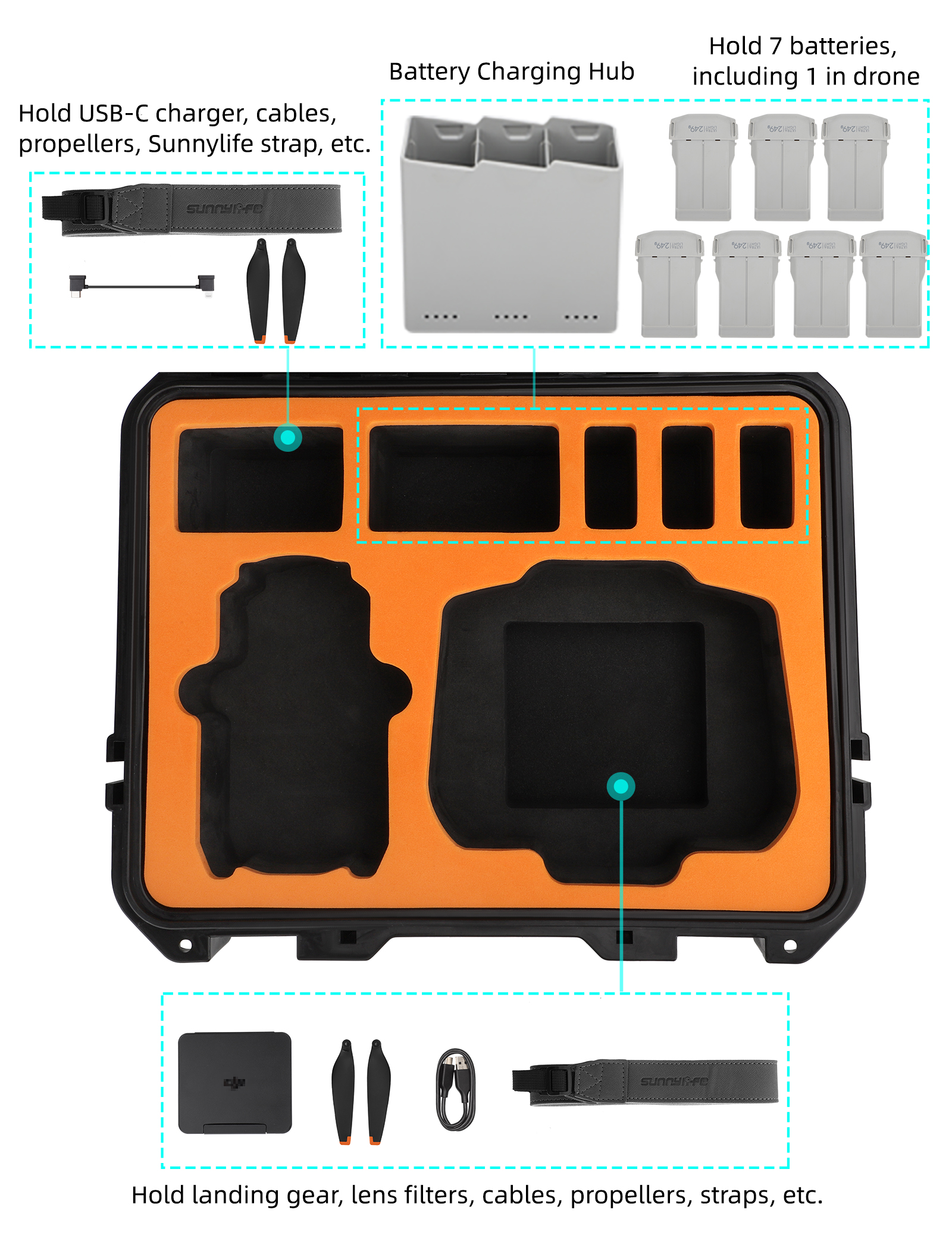 Large capacity, powerful installation. It can store drones, DJI RC2 or RC-N2, battery managers, 7 batteries (including one body), as well as accessories such as propellers, data cables, chargers, lanyards, Sunnylife filter boxes or spider tripods.