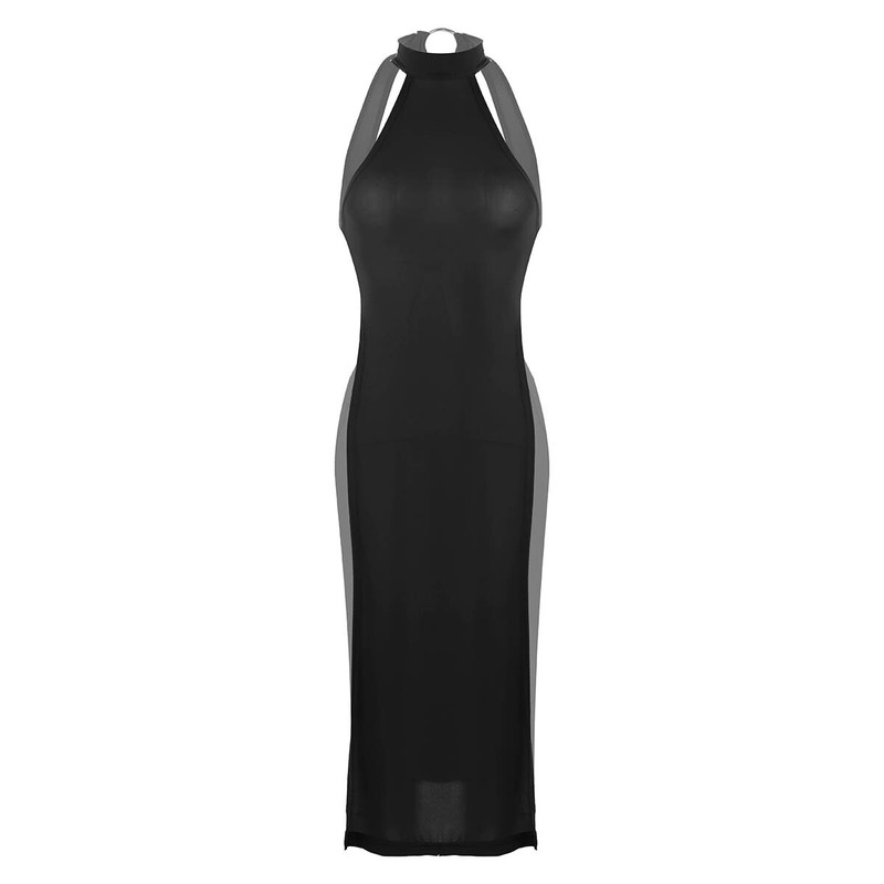 Halter neck with metal o-ring, sleeveless and backless, high slit leg and knee length, not see through.