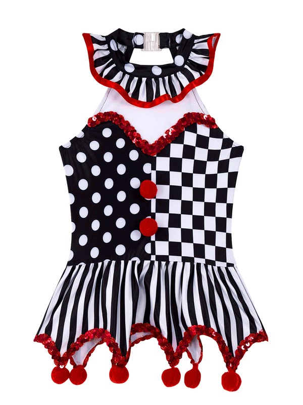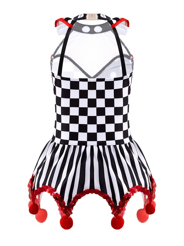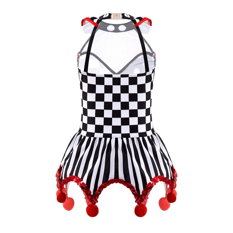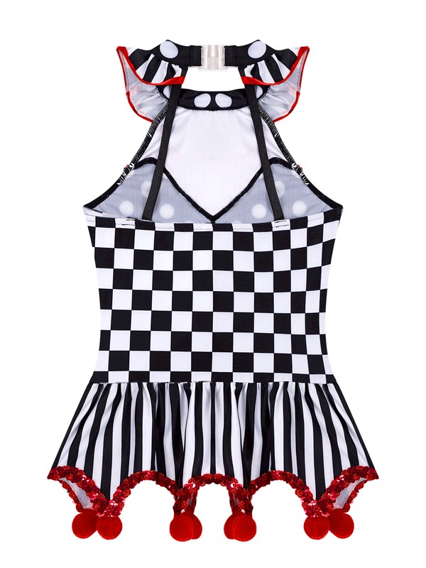 US Kid Girls Circus Clown Cosplay Halter Neck Sleeveless Plaid Polka Dots Dress