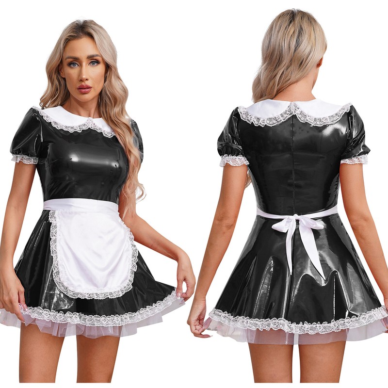 Womens PVC Leather French Maid Cosplay Dress Apron Set Sexy Clubwear Costume