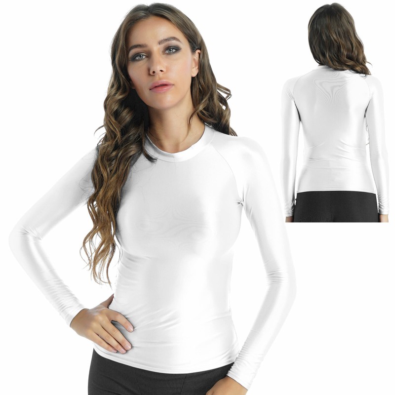 Women Glossy O Neck Long Sleeve T-shirt Ladies Slim Fit Tops Yoga.