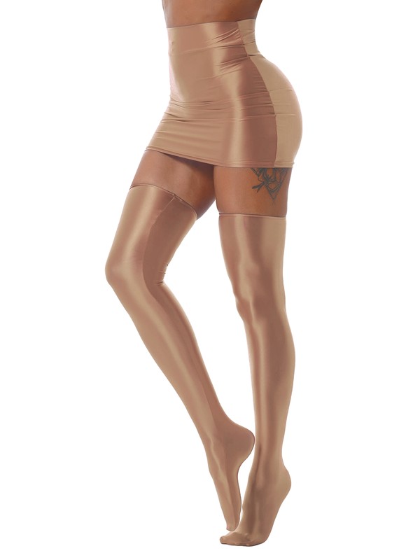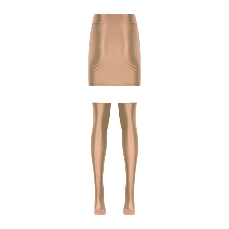 Glossy appearance, solid color, high waist mini skirt, matching a pair of thigh high stockings.