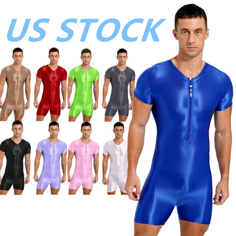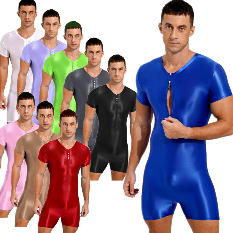 Short sleeve bodysuit, front zipper closure, round neck, glossy surface.