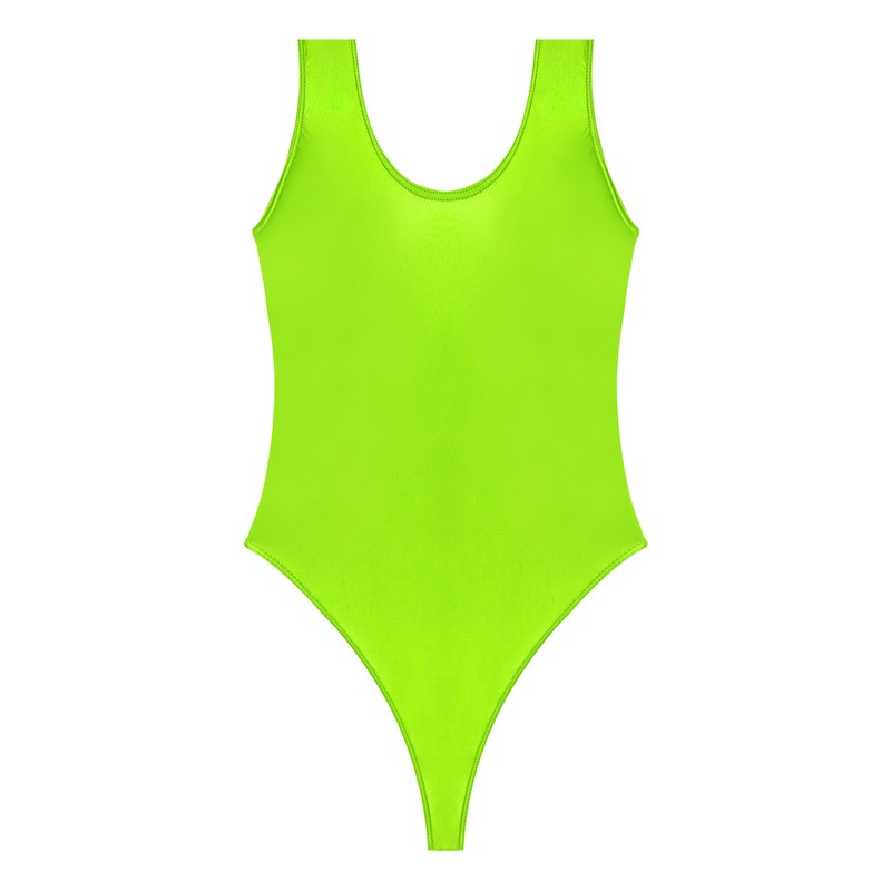 Glossy bodysuit, solid color, round neck, sleeveless, high cut design, backless.