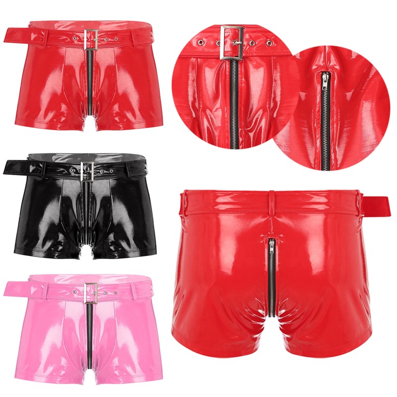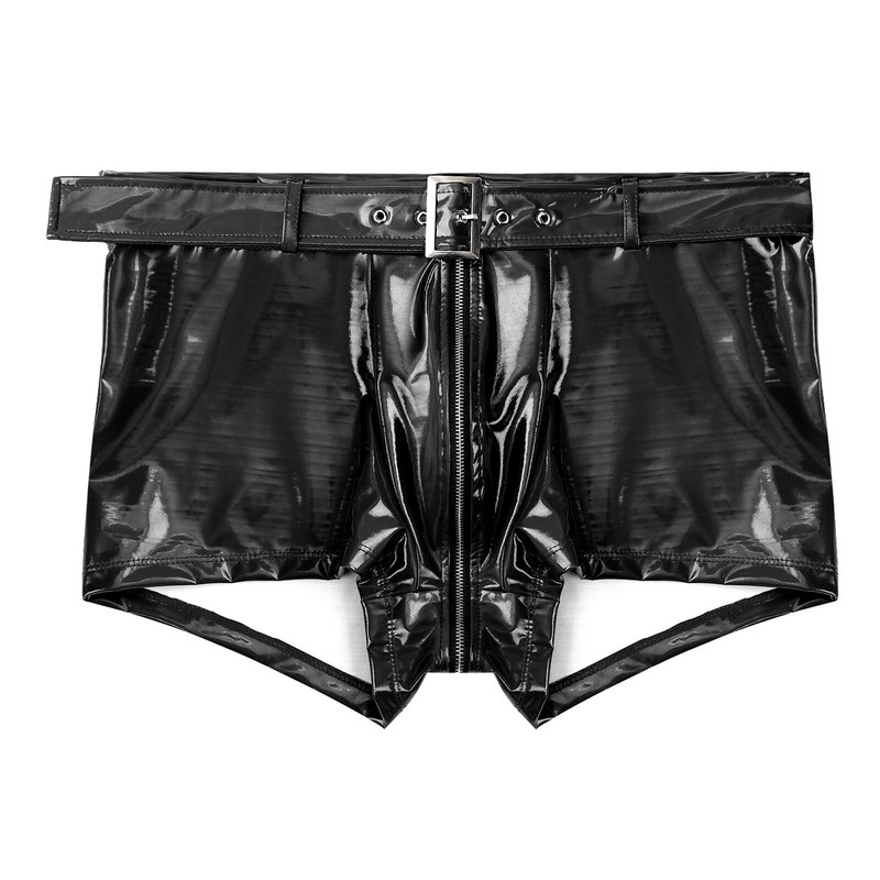 US Mens PVC Leather Wet Look Shorts Bulge Pouch Hot Pants Zipper Cortch Swimwear