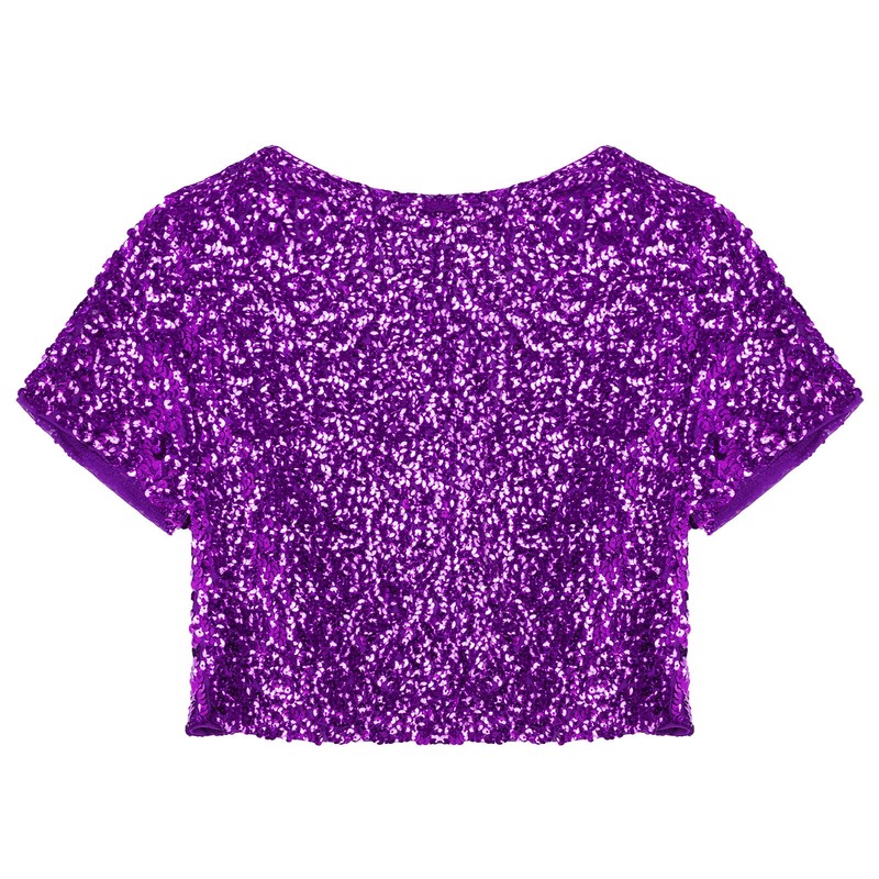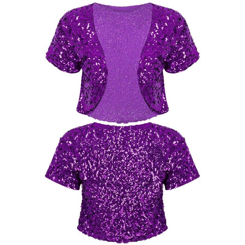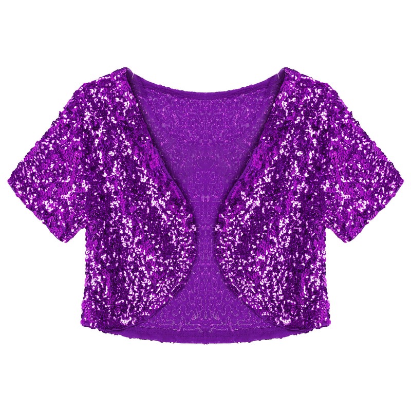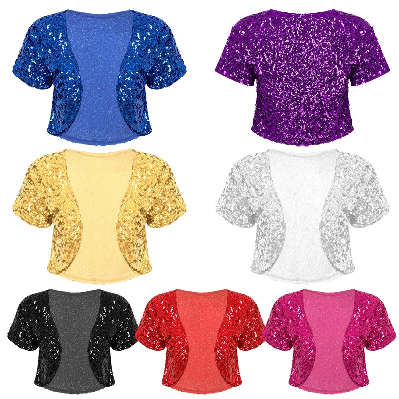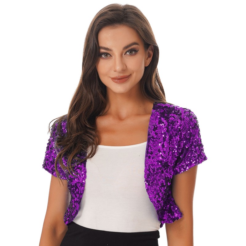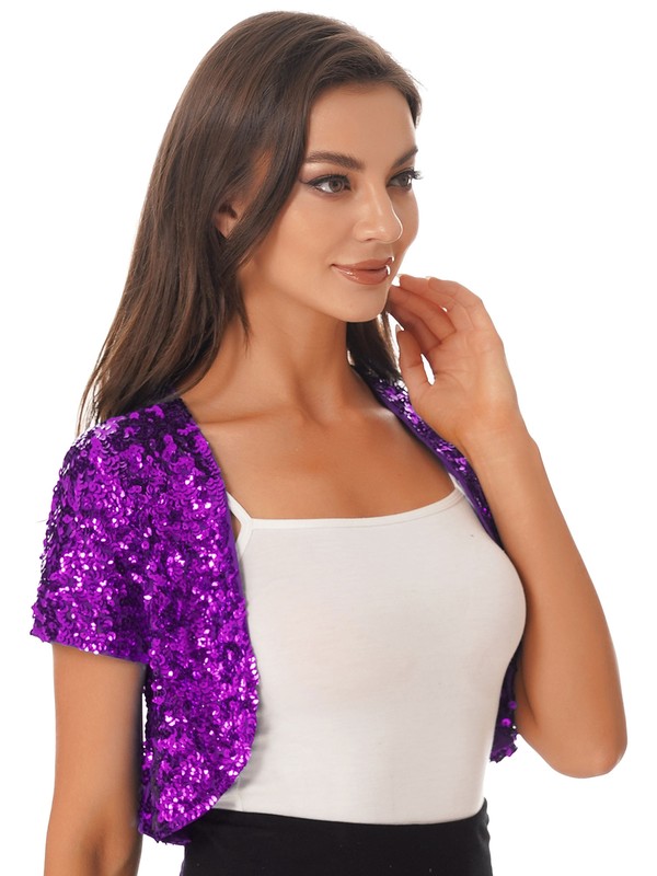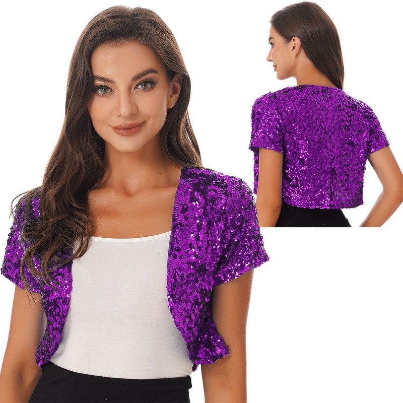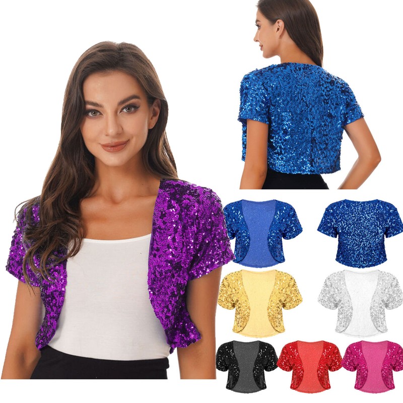 US Womens Short Sleeve Cardigan Allover Shiny Sequins Dance Cropped Shawl Shrug