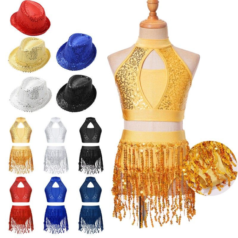 Kids Girls Shiny Sequins Latin Jazz Dance Tango Rumba Samba Salsa Skirts Costume