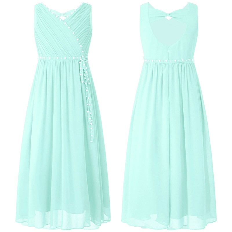 Pearls beaded adorned at neckline and sash, and the sash is detachable, making girls look elegant and attractive.