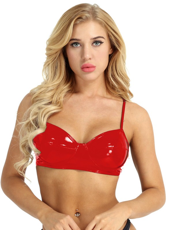 Women’s wet look patent leather bra top lingerie, wire-free and unlined design.