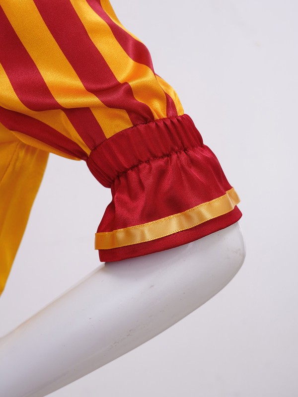 Little ruffle layer adorned neckline and waistline. Burgundy and yellow stripe design makes the set look funny and lovely.