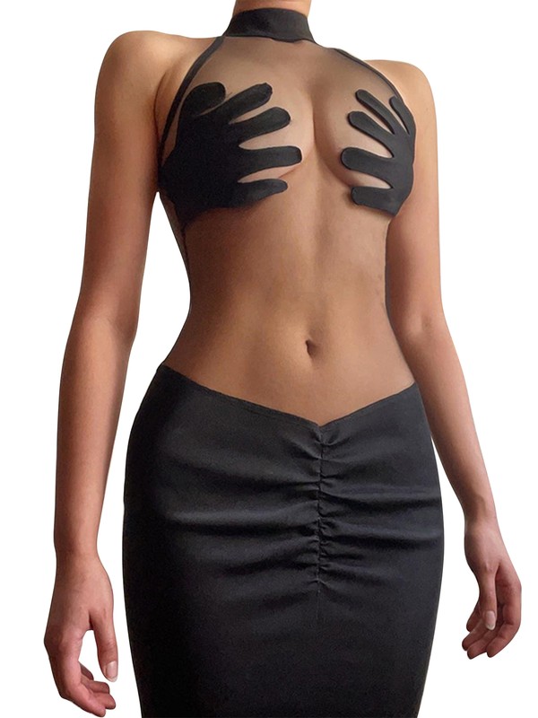 Women Gothic See-through Mesh Dress Punk Mock Neck Sleeveless Dresses for Halloween Rock Concert.