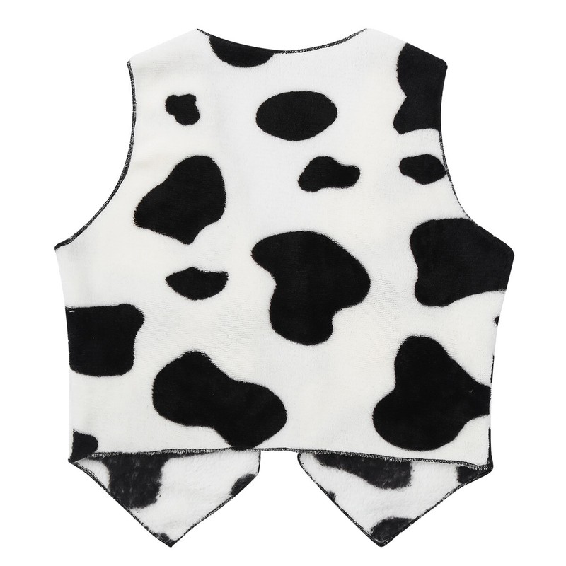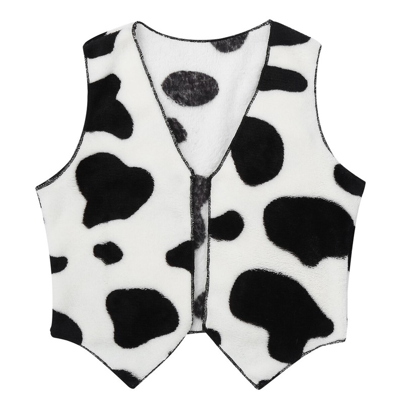 Sleeveless, open front(no fastenings), featuring a black and white cow pattern all over.