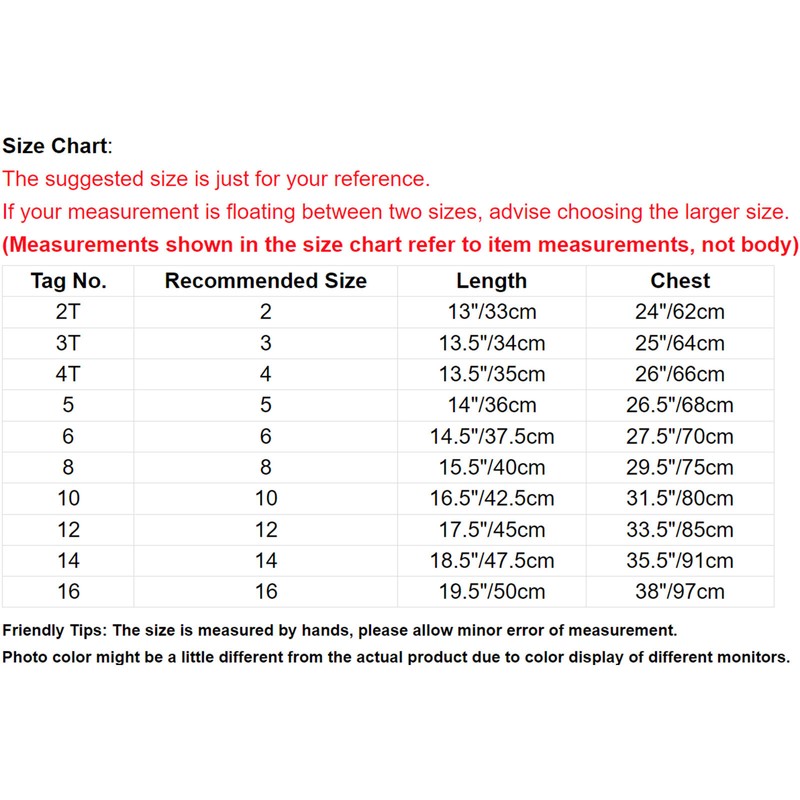 | Tag No. | Recommended Size for Kids | Chest | Sleeve Length(from Neck Seam to Cuff) | Length |