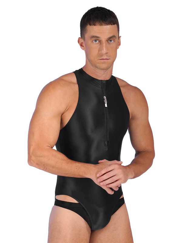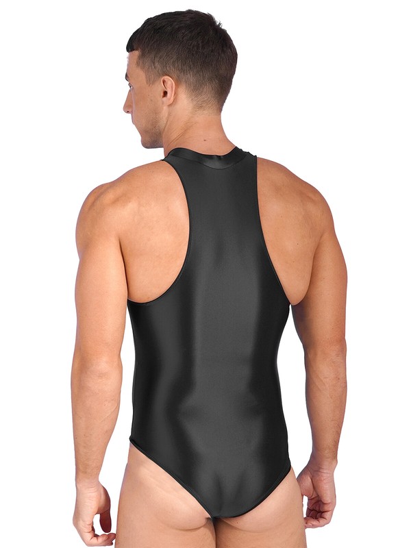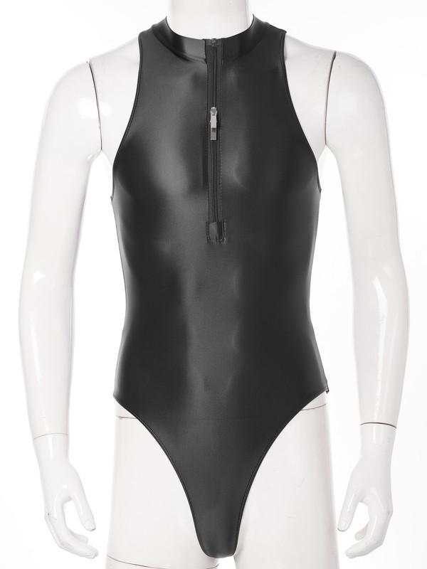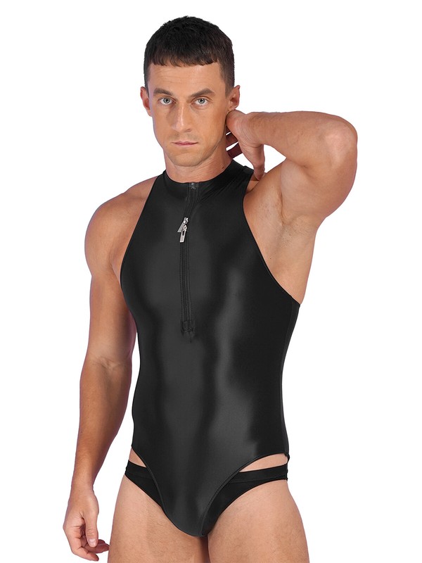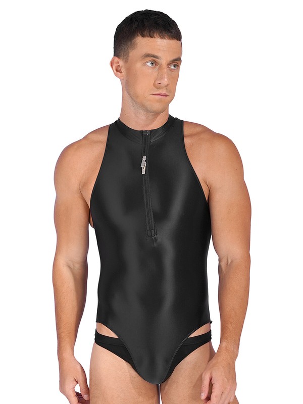 Solid color bodysuit for men, featuring with glossy appearance, sleeveless, two-way zipper closure in the front.