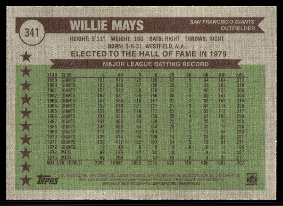 | Willie Mays 2025 Topps Heritage All Time All Stars Card #341 San Francisco |