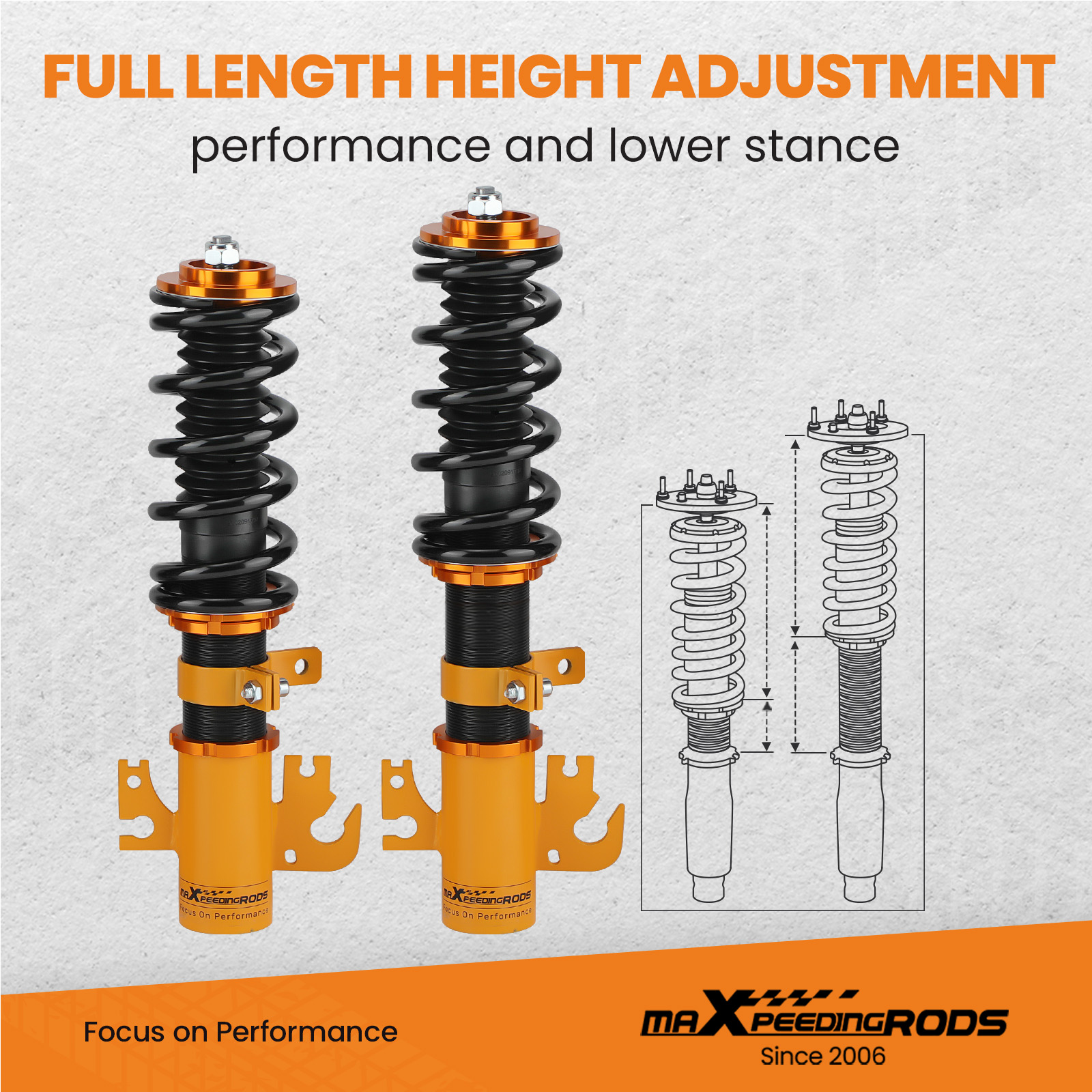 - Lowered height adjustment from 25-75mm (depends on vehicle models)which allows a lower center of gravity and also add a more aggressive stance