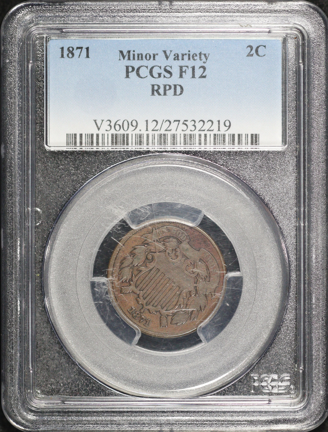 1871 Minor Variety Repunched Date Two Cent PCGS F-12 designed by James Barton Longacre.