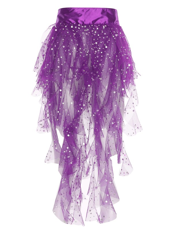 The cascading ruffles and sequined tulle add a touch of glamour and sparkle, making the skirt a trendy and eye-catching piece for any dance occasion.
