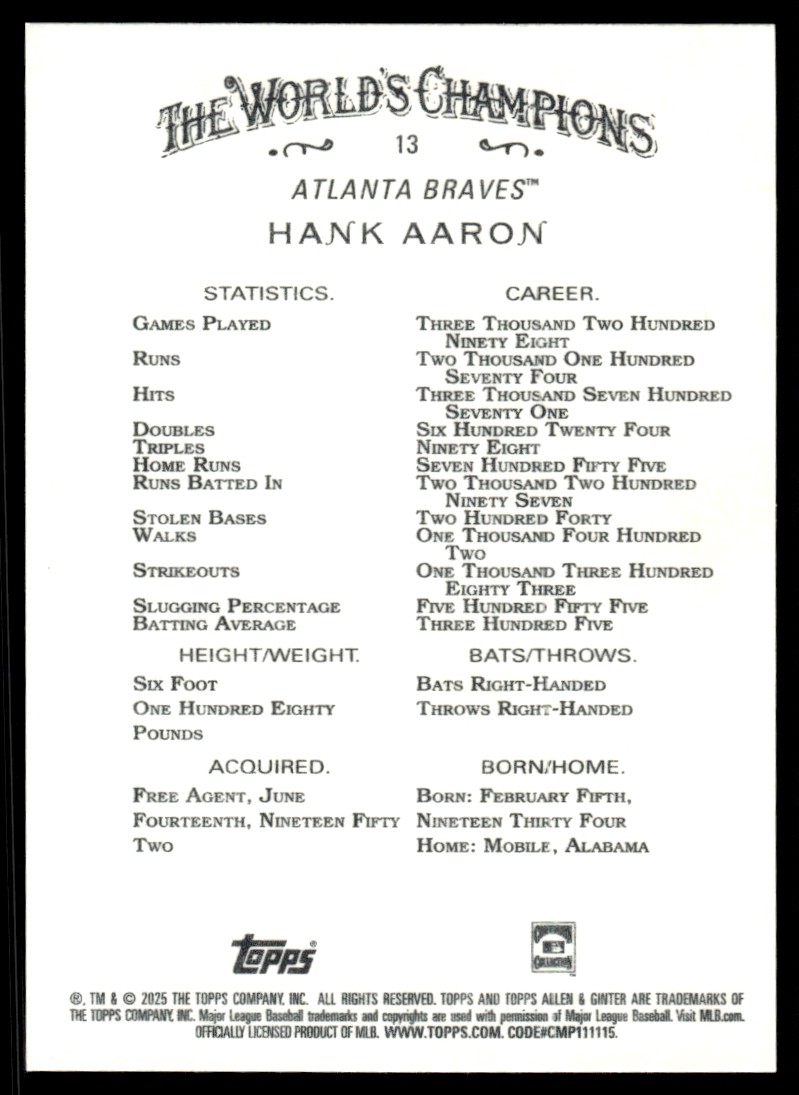 | Hank Aaron 2025 Topps Allen & Ginter Legend Card | #13 Atlanta Braves |