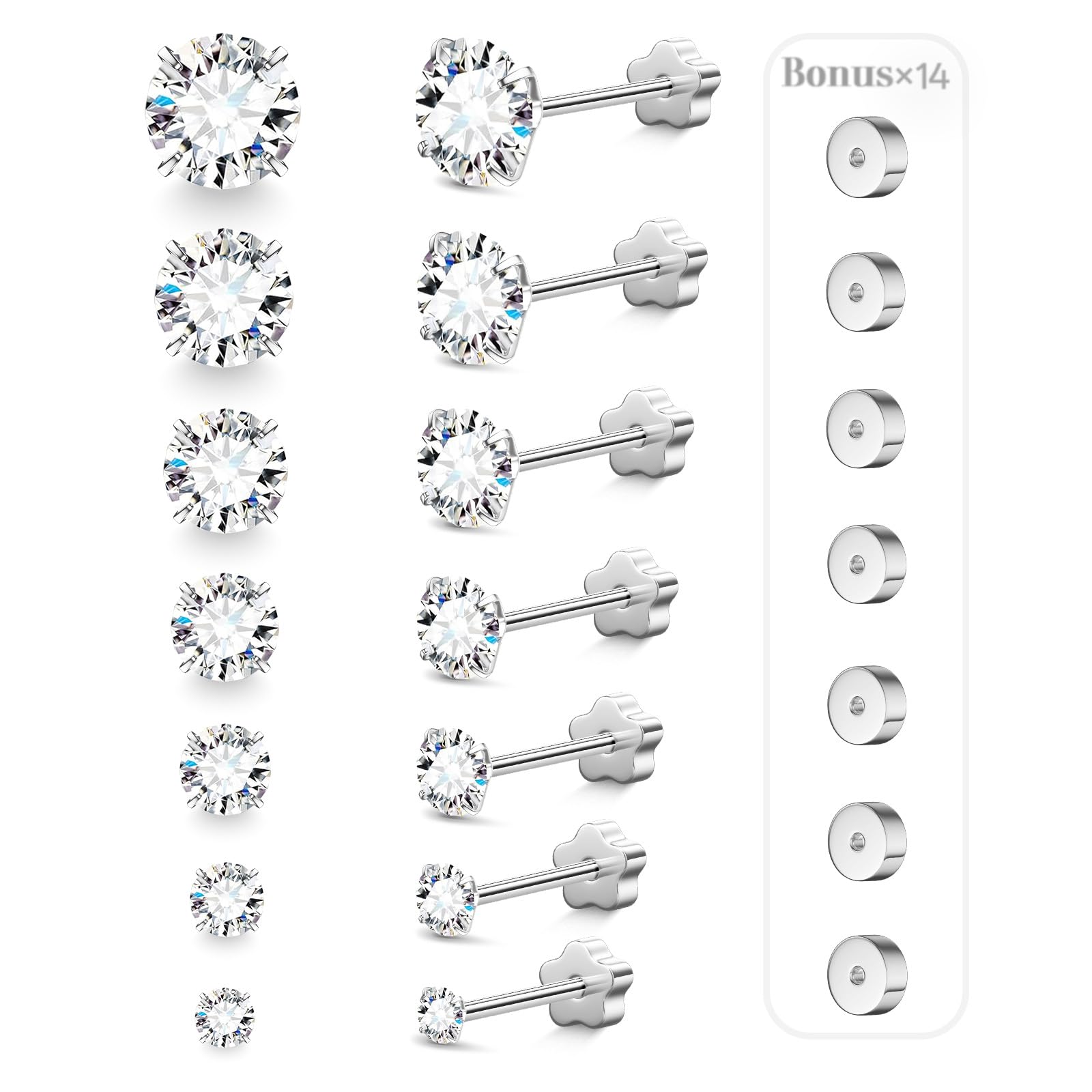 7 Pairs Multi Size Stud Earrings : 14k gold plated stud earrings, comes with 7 different sizes round cubic zirconia:2mm,3mm,4mm,5mm,6mm,7mm,8mm are available.Gauge Size:20 G=0.8 mm,Meet your needs in multiple sizes(Bonus: 7 pairs of flat-back disk earring posts)
