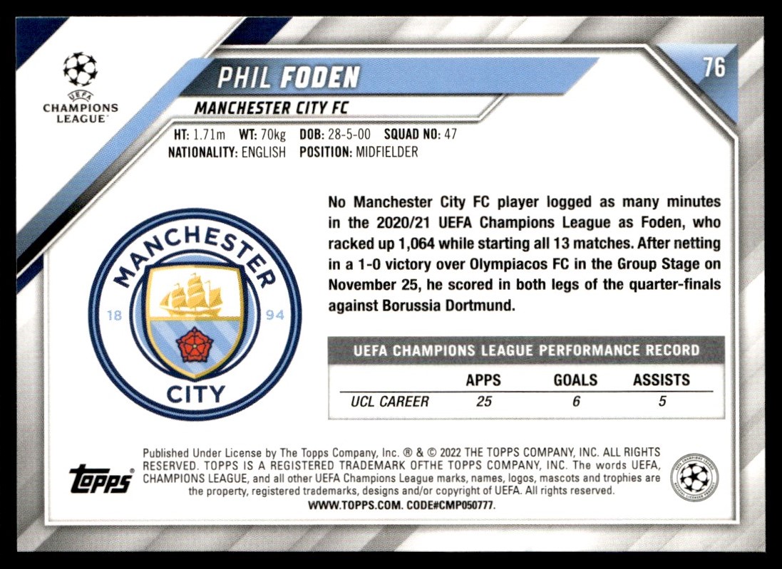 2021 Topps UEFA Champions League Phil Foden Manchester City #76