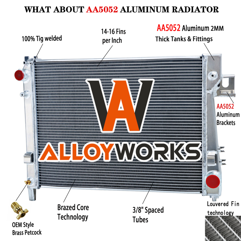 This AA5052 Aluminum Radiator is designed to provide maximum cooling efficiency to prevent premature engine failure. Its light-weight, and high-heat transferring aluminum features a tube and fin design that, dramatically increases surface area that enables the heat to dissipate more efficiently. This AA5052 Aluminum Radiator is at least 30%-45% more efficient than stock ones. Most importantly, it has a much higher capacity for coolant than stock ones, which means that your cooling system will be more efficient and will be more resistant to temperature surges in racing applications.