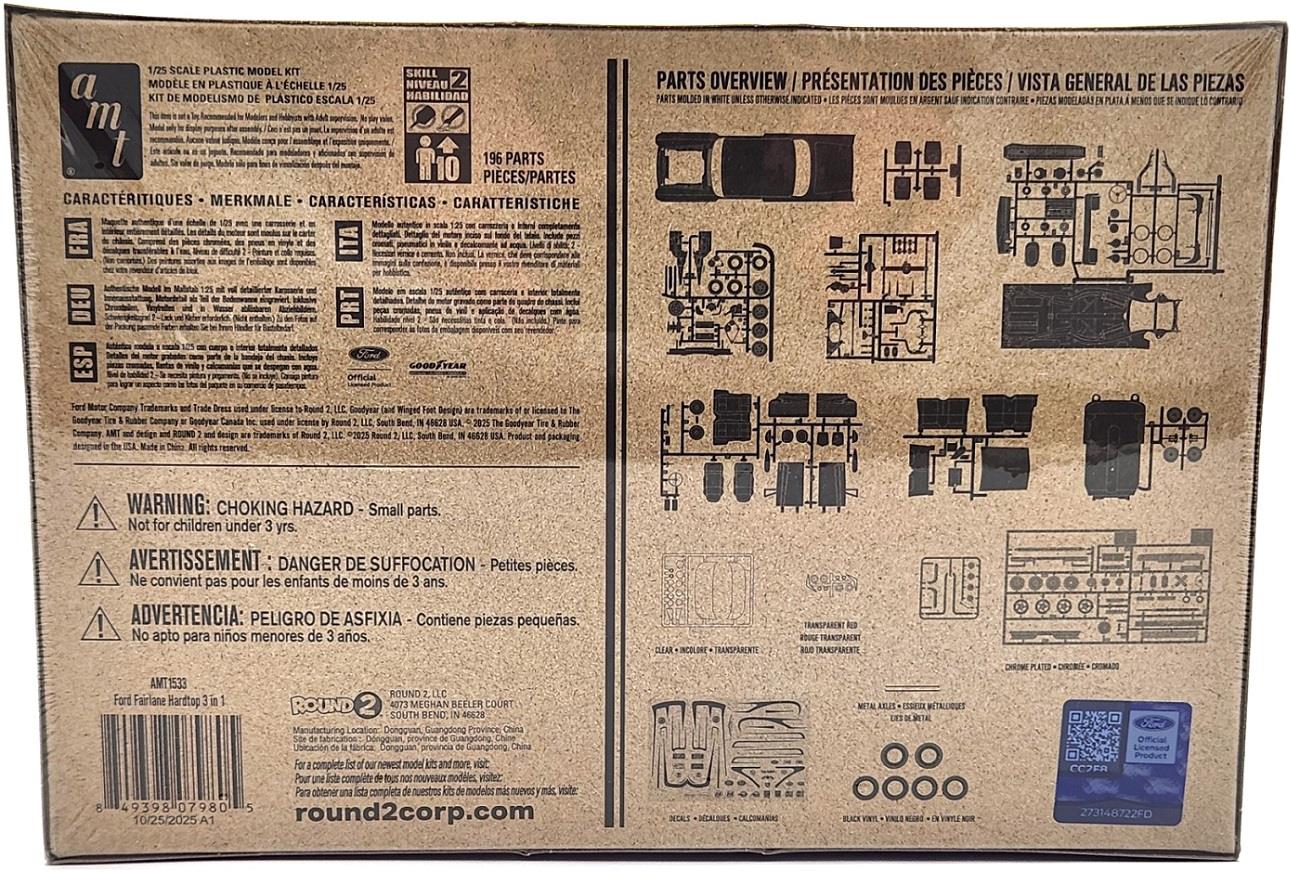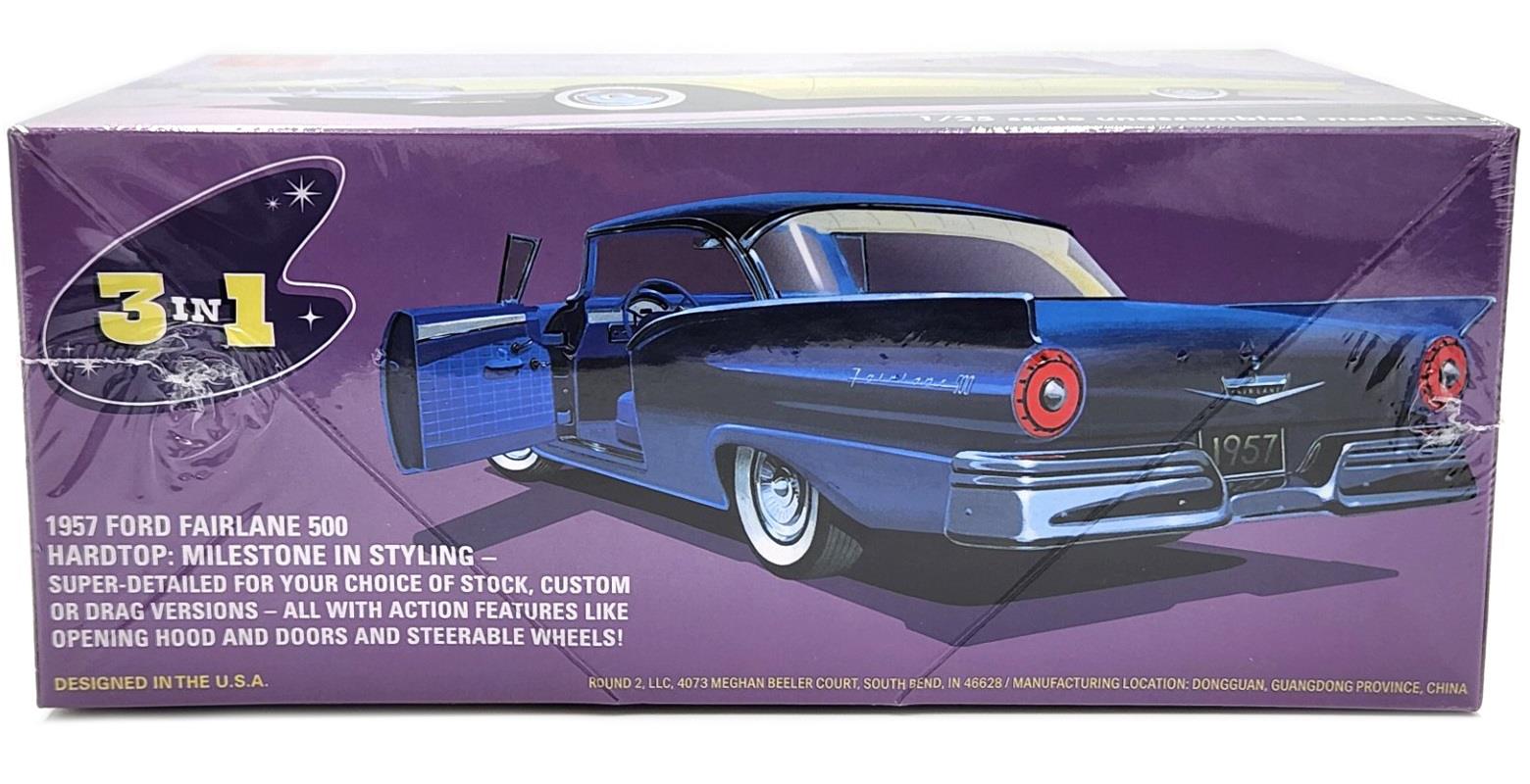 AMT 1957 Ford Fairlane Hardtop 3-in-1 1:25 Scale Model Kit.This super-detailed 3-in-1 kit lets you build a stock cruiser, custom show car, or drag strip contender, all featuring realistic action parts like opening hood and doors, steerable wheels, custom front and rear options, and a fully detailed custom interior.