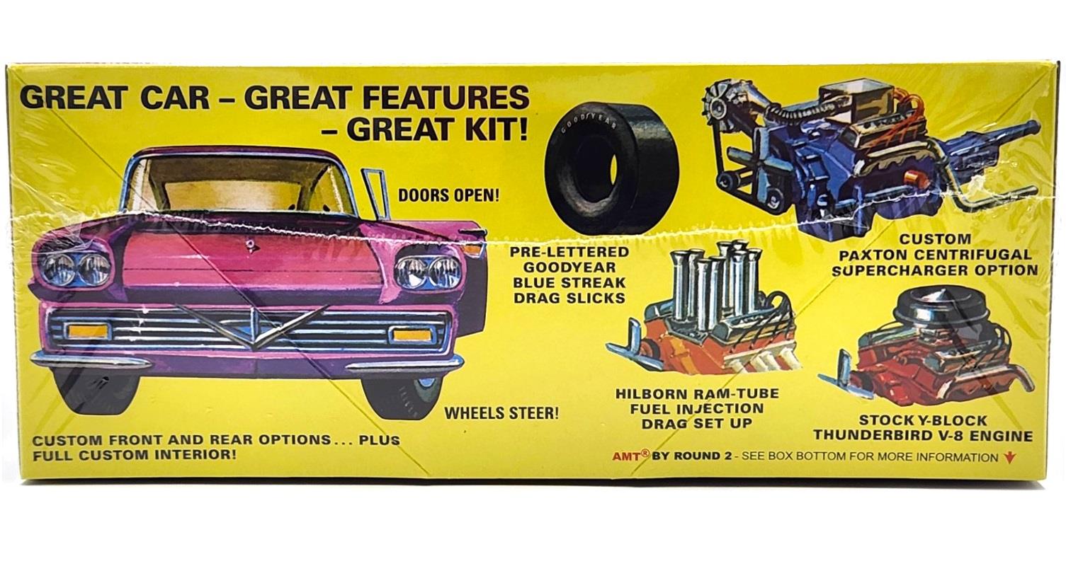 This super-detailed kit includes so many parts it barely fits in the box: Thunderbird V8 features optional Hilborn ram-tube fuel injection drag setup or custom Paxton centrifugal supercharger. Full custom interior features quad tufted bucket seats and full-length console. Choice of either factory stock wide-whitewall tires or pre-lettered drag slicks. All new decals offer a custom scallop treatment with body emblems, scripts, dash panel gauges, license plates, and more!