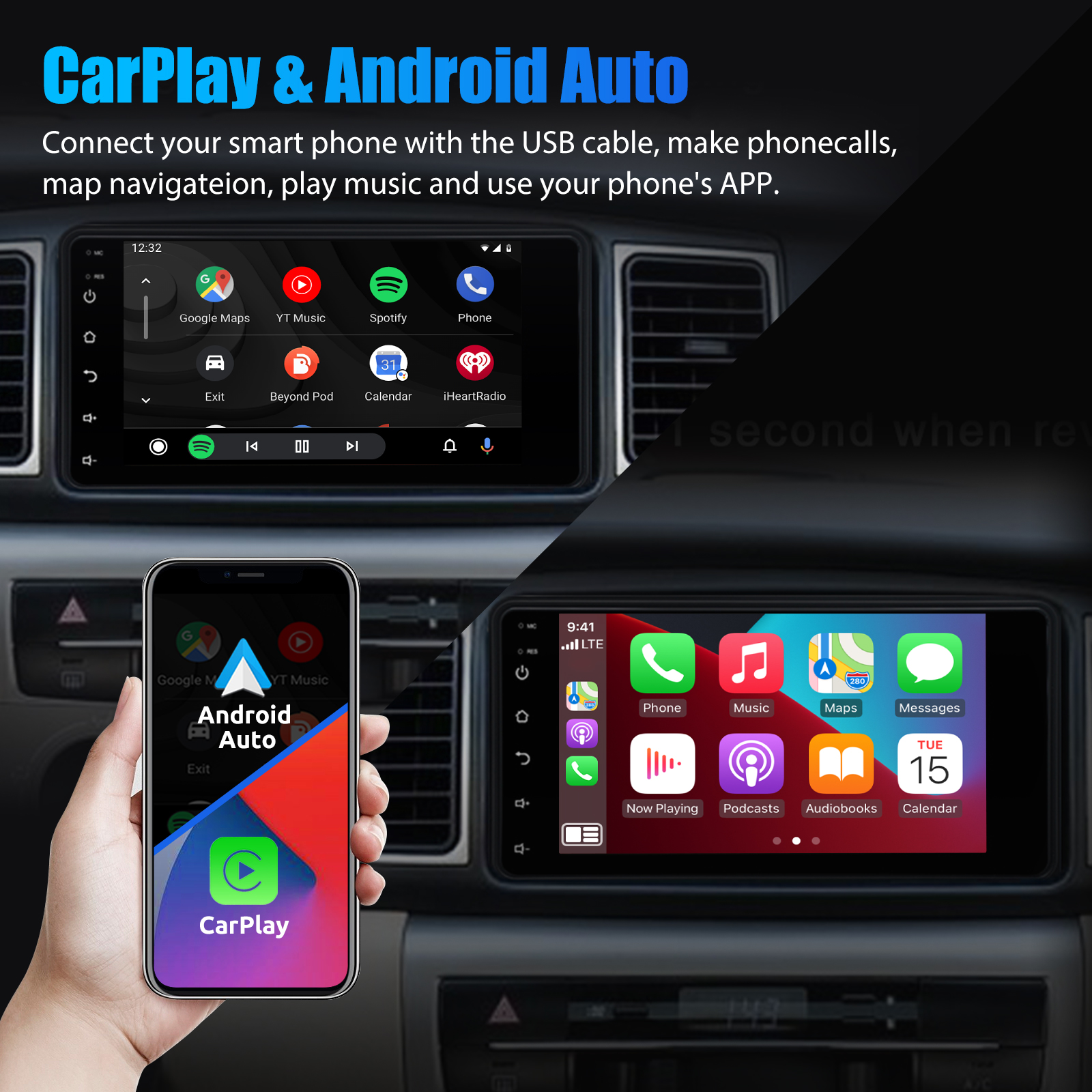 MIRROR LINK & APPLE CARPLAY & ANDROID AUTO: With this car radio, you can experience the amazing Mirror Link function, compatible with iOS and Android phones. You can mirror your smartphone screen to the car radio using apps like Google Maps, Spotify, Youtube, etc. Replace your cell phone with the car screen and turn your vehicle into a smart platform. Immerse yourself in a seamless and user-friendly infotainment experience with Apple CarPlay & Android Auto. Connect your iPhone to Apple CarPlay or your Android smartphone to Android Auto and securely access calls, texts, navigation, music and more. With intuitive operation via the touchscreen or voice control, you have all functions at your fingertips while you remain safely at the wheel. Use your favorite apps and stay connected at all times while keeping your eyes on the road. Turn your vehicle into an extended hub for your mobile devices and experience a new dimension in infotainment.