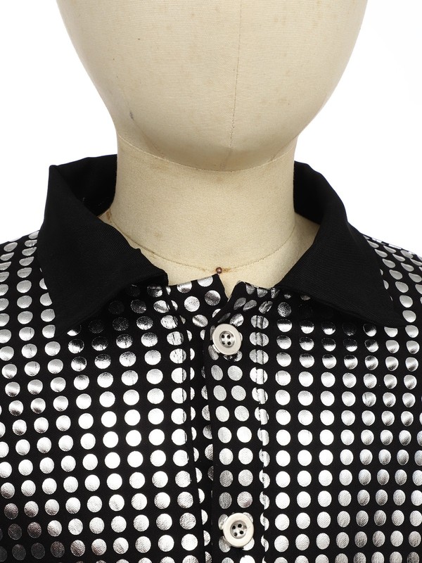 The shiny fabric of the costume set reflects light, creating a dazzling effect under disco lights, perfect for a party atmosphere.