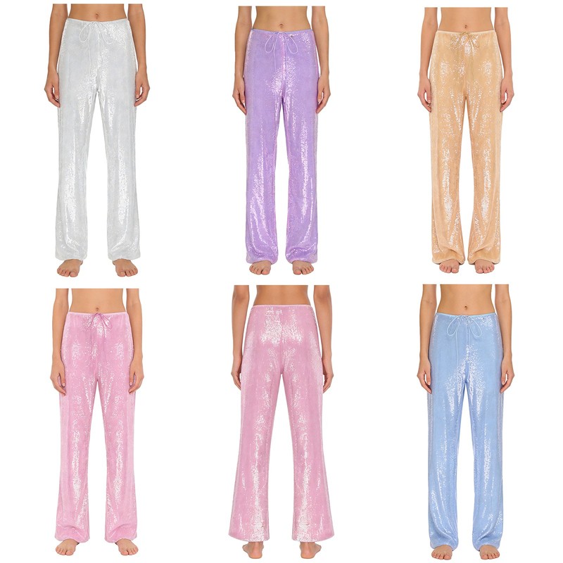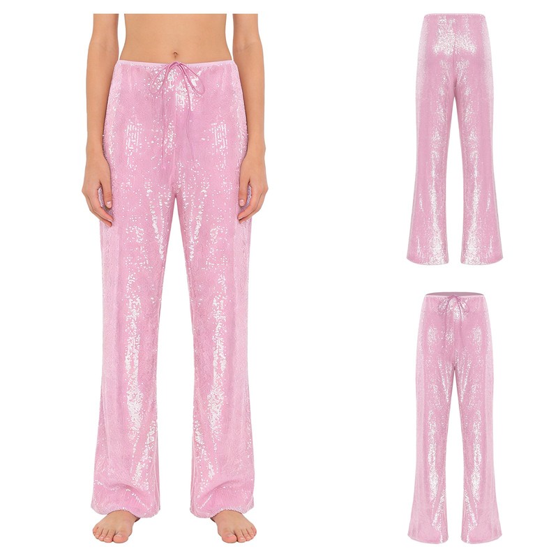Made from a blend of polyester and sequins, these pants are both durable and have a dazzling sparkle, providing a unique texture and look.