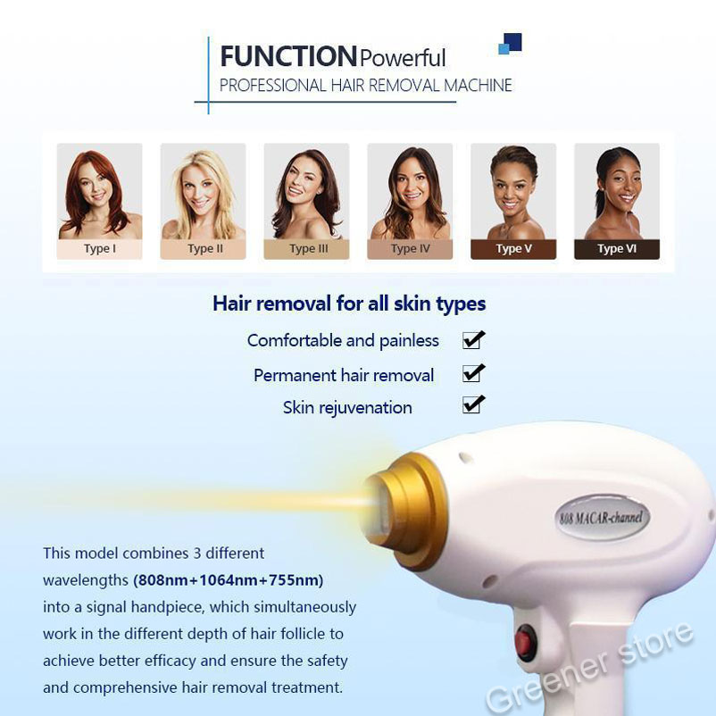 * Laser 755 nm : pour l'épilation des poils fins et efficace pour les poils de couleur claire, comme les poils autour des lèvres, les sourcils, etc.