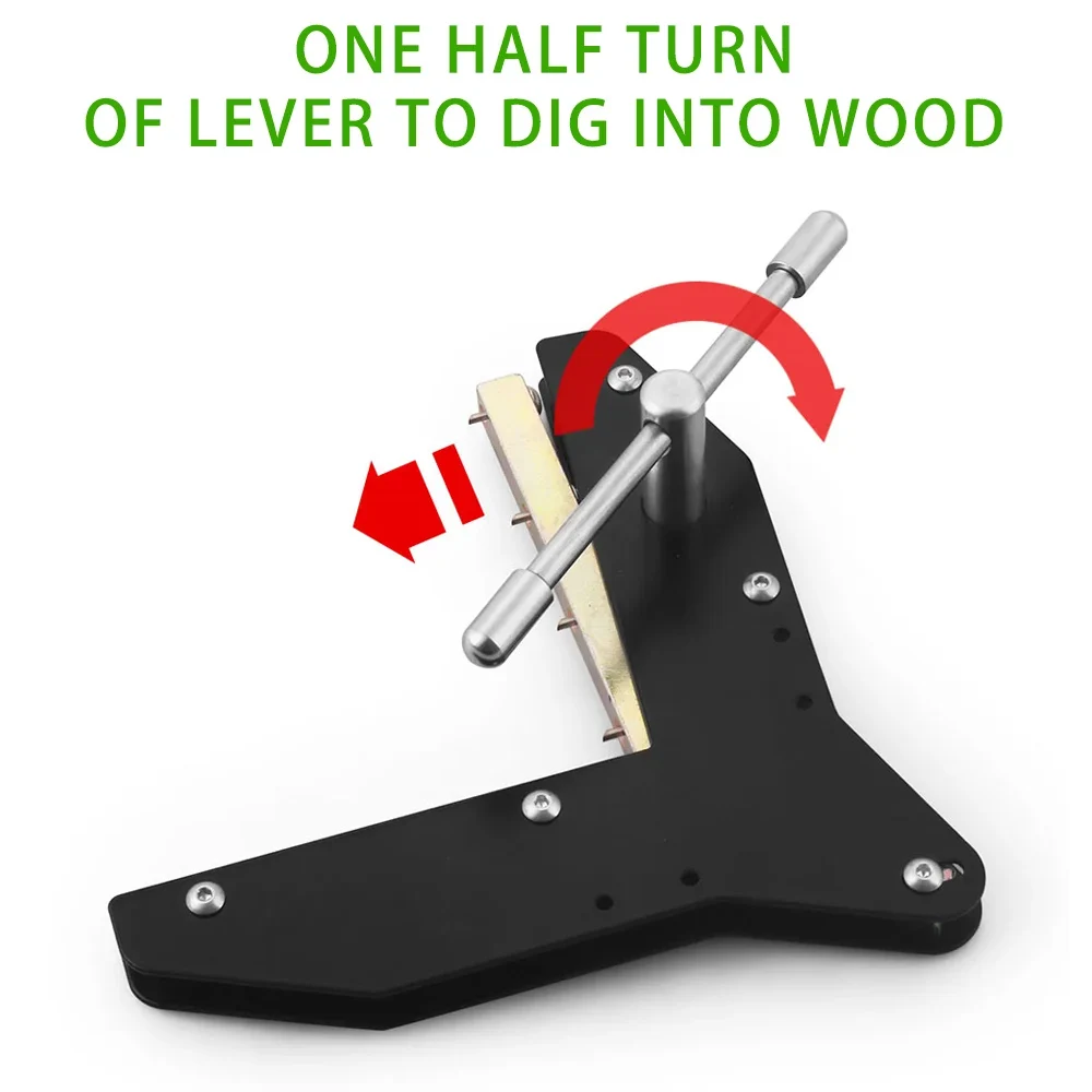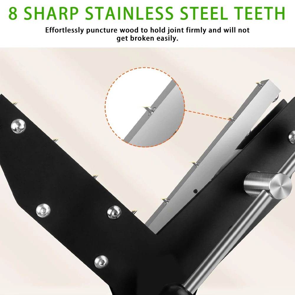The rotating cam pushes the bar out, through which four sharp teeth are evenly threaded. The four hardened teeth easily penetrate the wood for firm grip and bars put very high pressure all across the miter joint for a precise glue joint