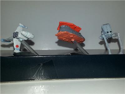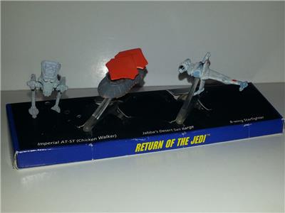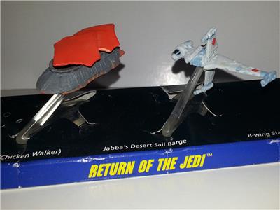 This is an original Galoob STAR WARS Return of the Jedi ROTJ Micro Machines Vehicle Set! Three vehicles from ROTJ - all near mint condition - AT-ST Scout Walker, Jabba the Hut's Sail Barge and B-Wing Fighter. Both Jabba's Sail Barge and the B-Wing come with their clear plastic display stands (the AT-ST didn't come with one). The cardboard based is in overall very good condition with some surface marks in spots. Vehicle pieces themselves are in like new/unused condition