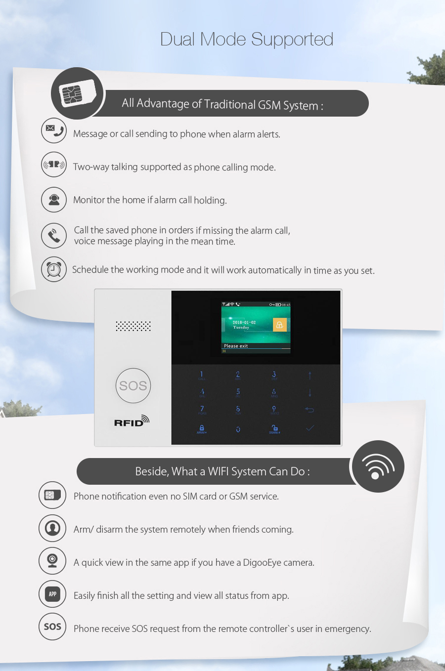 A:Yes. User can connect alarm system with WIFI and GSM Sim Card to work. And when Alarm System be triggered, it will push alarm message to the APP via WIFI. And if the WIFI failure, will change GSM mode auto Dial Out.