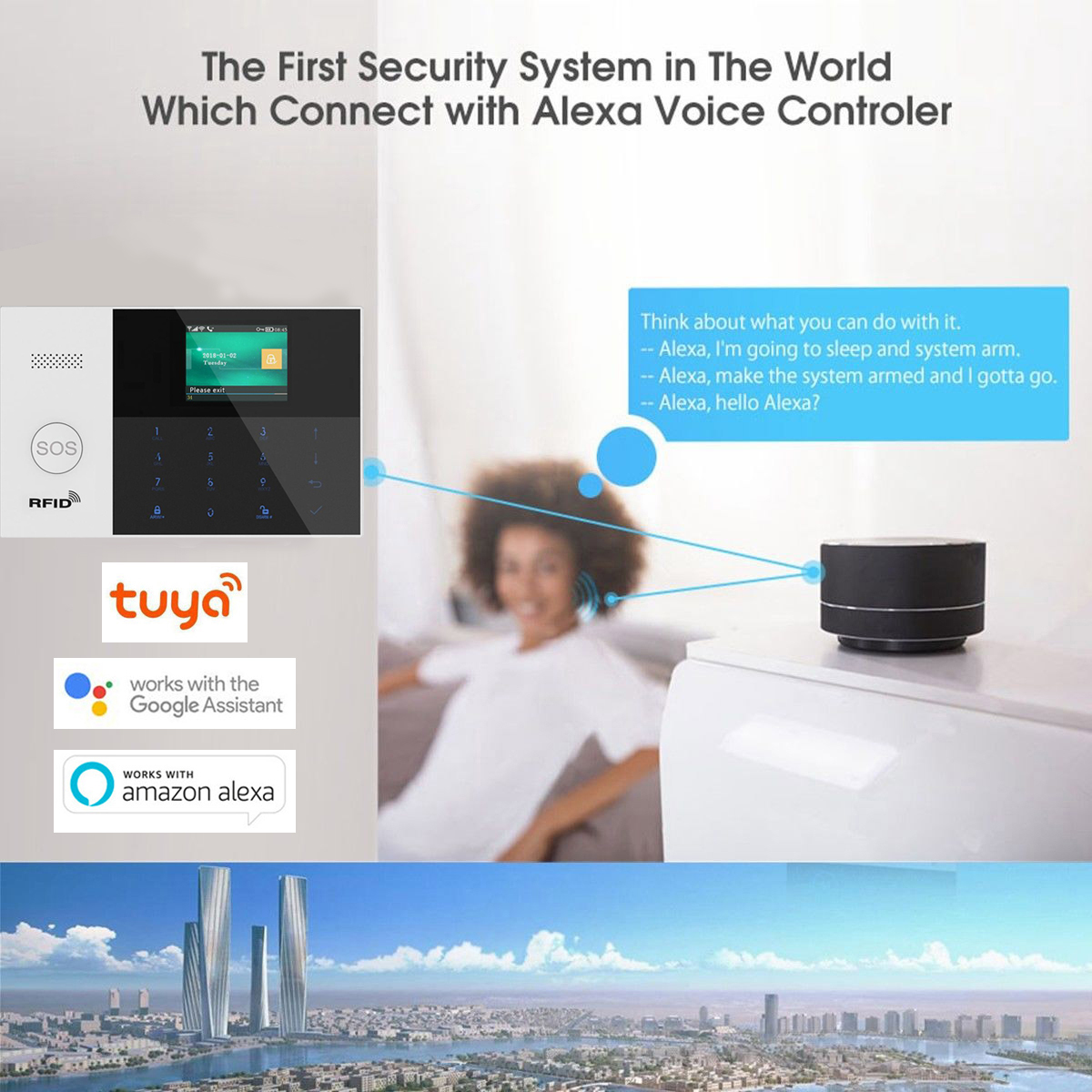 A: Compatible with Alexa and Google home: This alarm sysetm works with Amazon Alexa and Google Home for voice control ( Alexa and google home devices not included ). Just ask app Alexa on your phone to Arm / Disarm/ the whole system in a specific instruction like "Alexa, please arm the alarm system". Remote control your Alarm system anywhere in the world with your smart cell phone, no need repeated operation!
