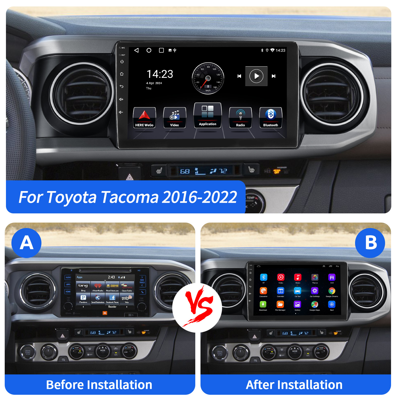 10.1 Inch Android 14 Car Radio For Toyota Tacoma 2016-2022: The Android car radio with 10.1" 1280* 720 HD IPS capacitive touchscreen, 2GB RAM and 32GB ROM allows you to download your favorite apps and videos, so driving is no longer boring. No extra frame, no cable change, plug and play. It comes with Canbus and supports most original functions: Steering wheel control, reverse signals and reading original computer data, etc.