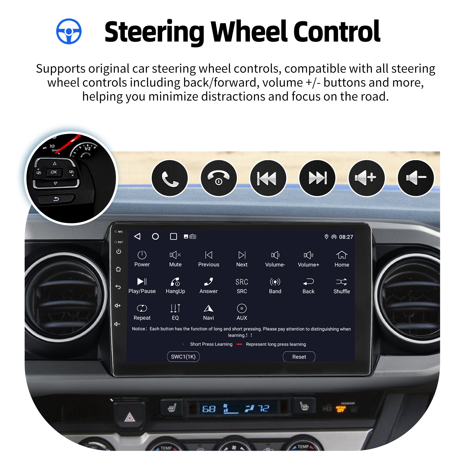AHD Rear View Camera Input & Steering Wheel Control: After connecting to the rear view camera. The radio automatically displays the reversing image as soon as you engage reverse gear. Make your daily reversing safer. Support AHD camera. Support original car steering wheel control to make driving more convenient and safer.