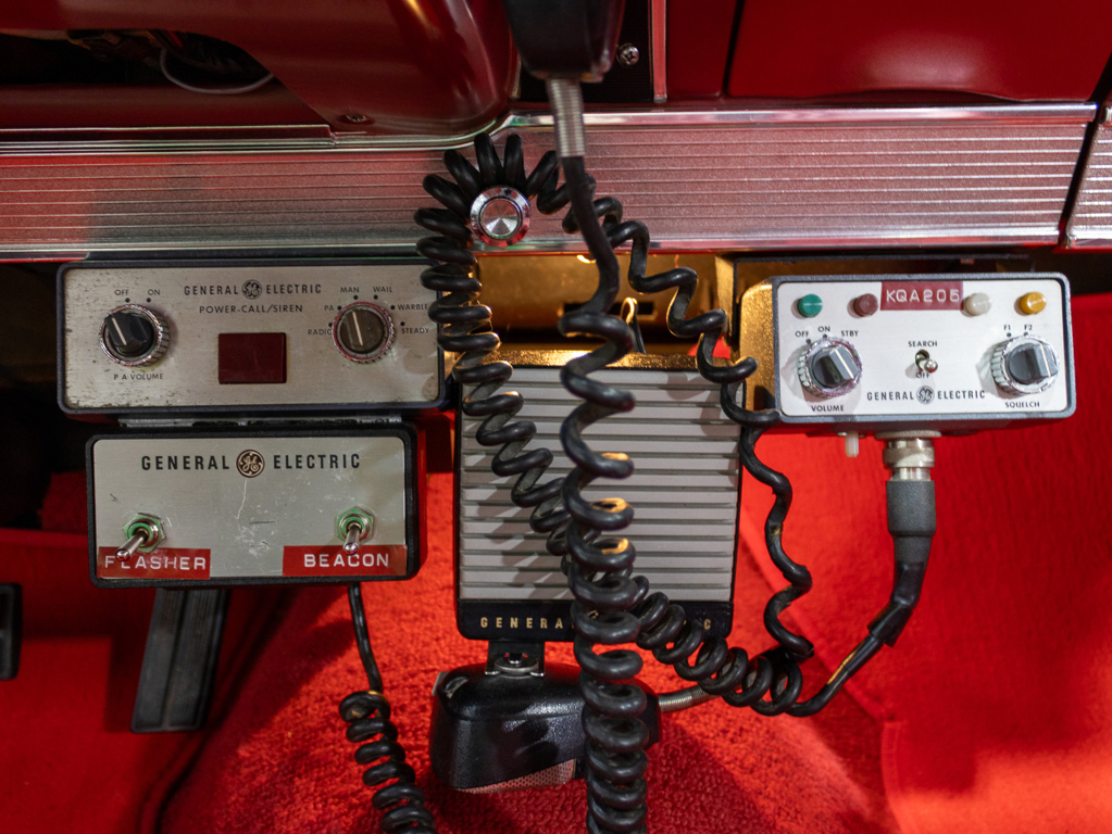 • Siren/Comms: Fully functional GE PowerCall multi-tone siren with PA/speakers. Includes a GE Two-Way radio (display) with a period whip antenna.