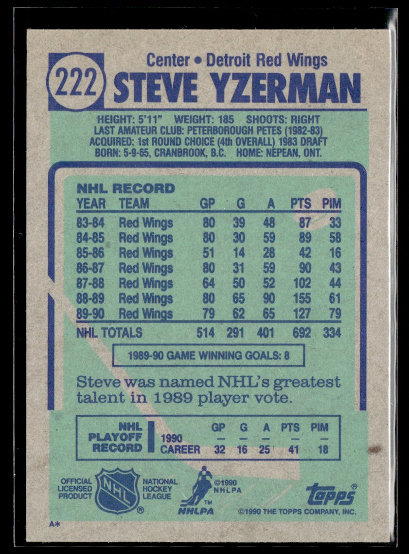 | 1990-91 Topps HOF B Steve Yzerman Detroit Red Wings #222 |