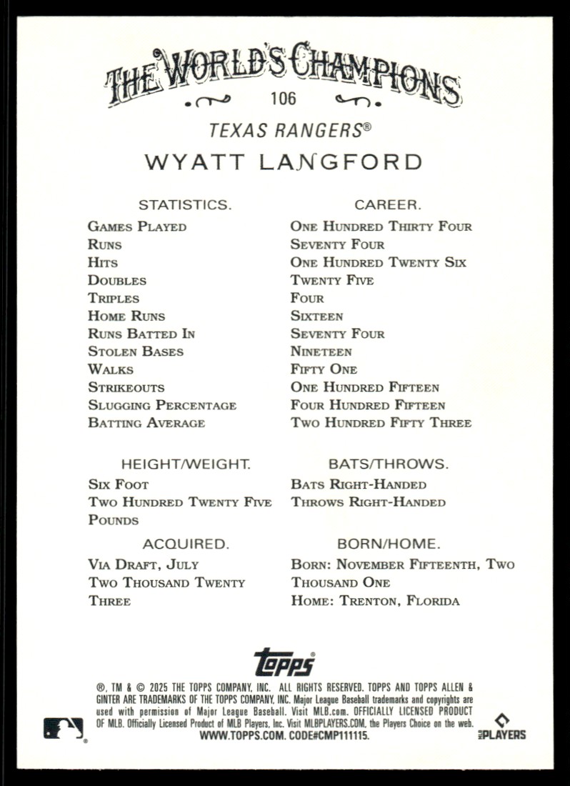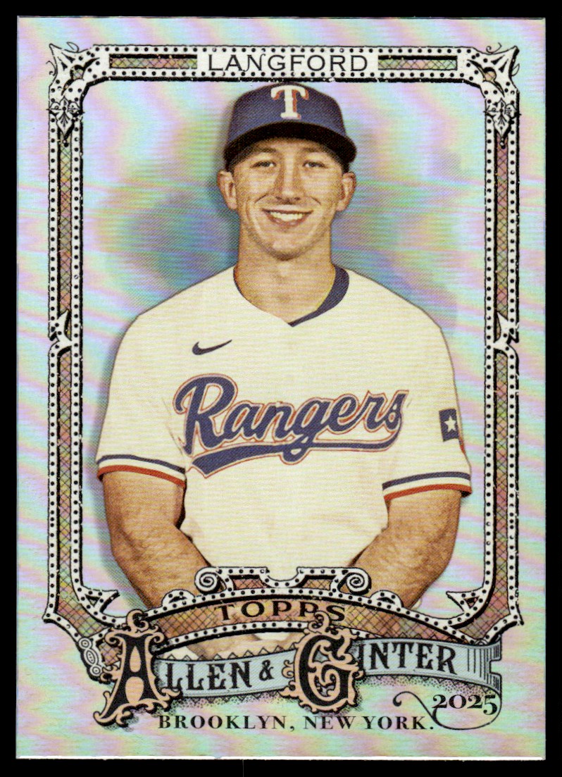 | Description: | Wyatt Langford | | Category: | Baseball | | Year: | 2025 | | Product: | Topps Allen & Ginter | | Team: | Texas Rangers | | Card Number: | 106 | | Special: | Silver Portrait Foil Card | | Dimensions: | 3½" x 2½" | | SKU: | BL A0001 R01 V (19) |