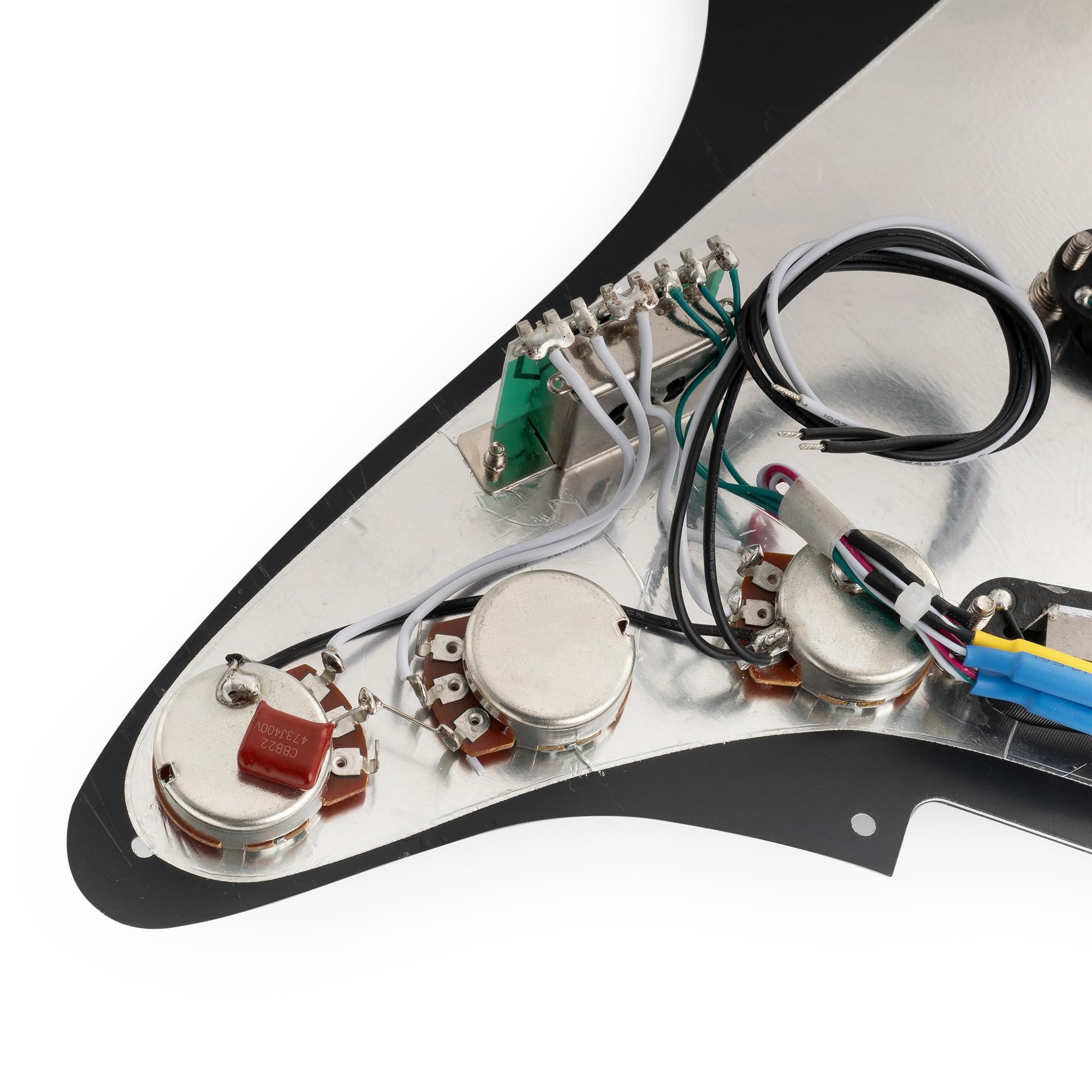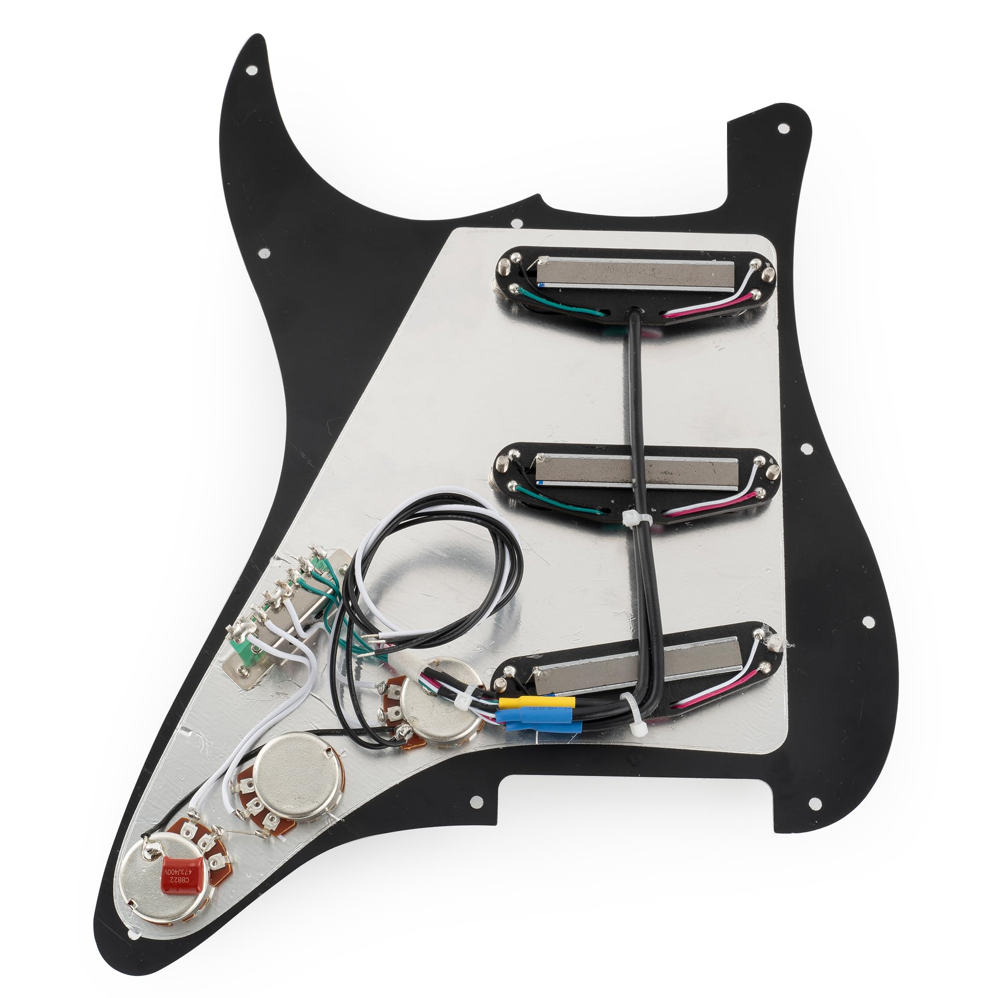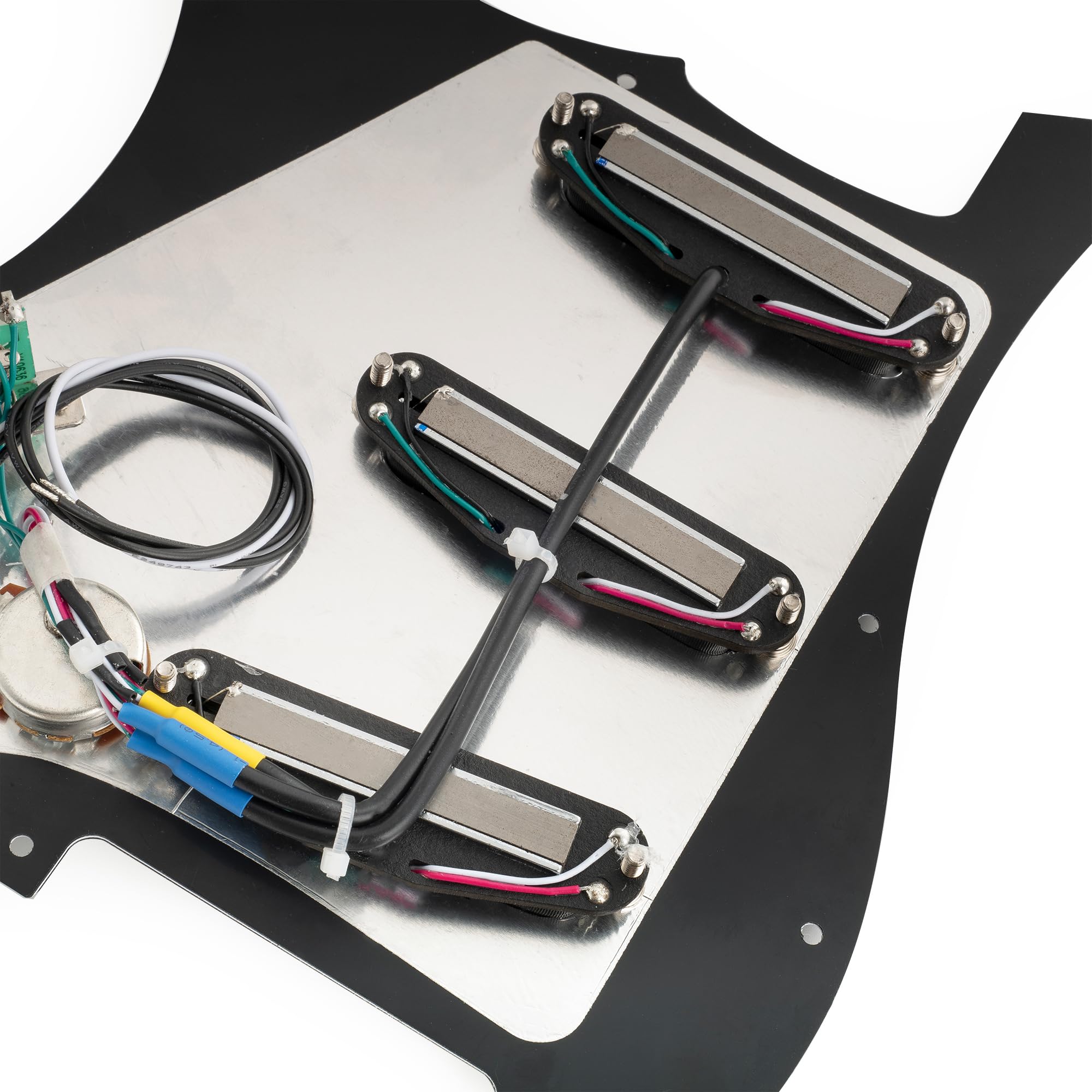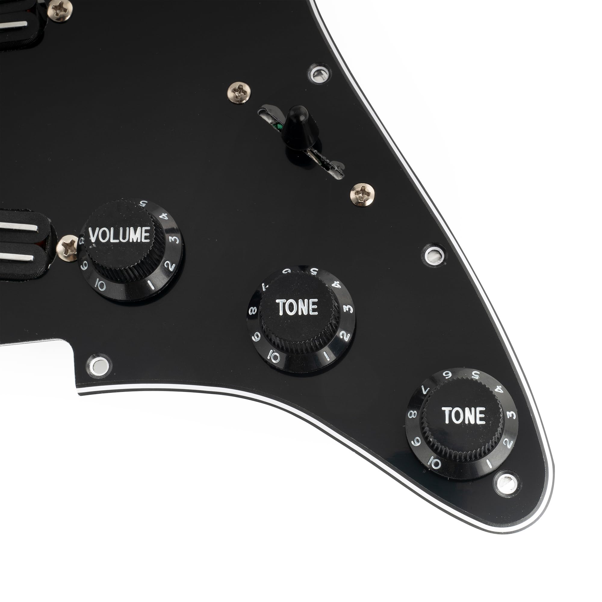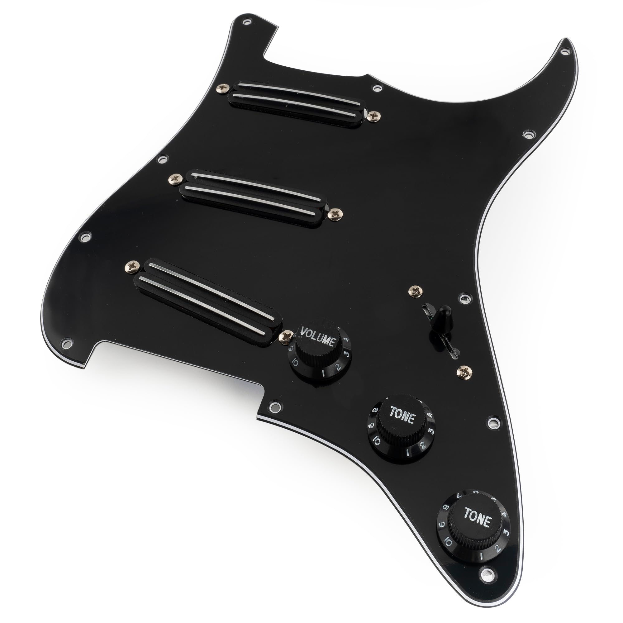 This pickup is a great upgrade for a Squier Strat SSS or other similar import guitars, and also works well with most modern American/Mexican-made standard Strat SSS-style electric guitars. It delivers a significant improvement in sound quality. This single-coil, dual-rail humbucking pickup features an Alnico 5 magnet for a rich, full-bodied sound. The dual coil and twin-blade pole pieces provide hum cancellation. The 9.2K pickups in the neck and middle sections deliver medium output, powerful lows and midrange, and the 13.2K pickups in the bridge section deliver high output, similar to a Super Distortion. Ideal for distortion, hard rock, and metal tones. This kit is handcrafted by experienced technicians, featuring carefully selected parts, meticulous attention to detail, and rigorous in-house testing. The included instruction manual with clear, professional wiring diagrams makes wiring easy. Package includes: 1 pre-wired pickguard. Pickups (neck/middle/bridge): Resistance: 9.2K/9.2K/13.2K, Tolerance: 1K, Magnet: Alnico 5, Rail Length: 60mm, Pots: A500K(T) x 2 + B500K(V), Imported 5-way switch, 0.047uf capacitor, PVC wire. Musiclily Pro-SE ST-DPHA SSS Strat Pre-wired Pickguard for Strat Electric Guitar, Alnico 5 Single-Size Humbucker, 3-Piece Black.