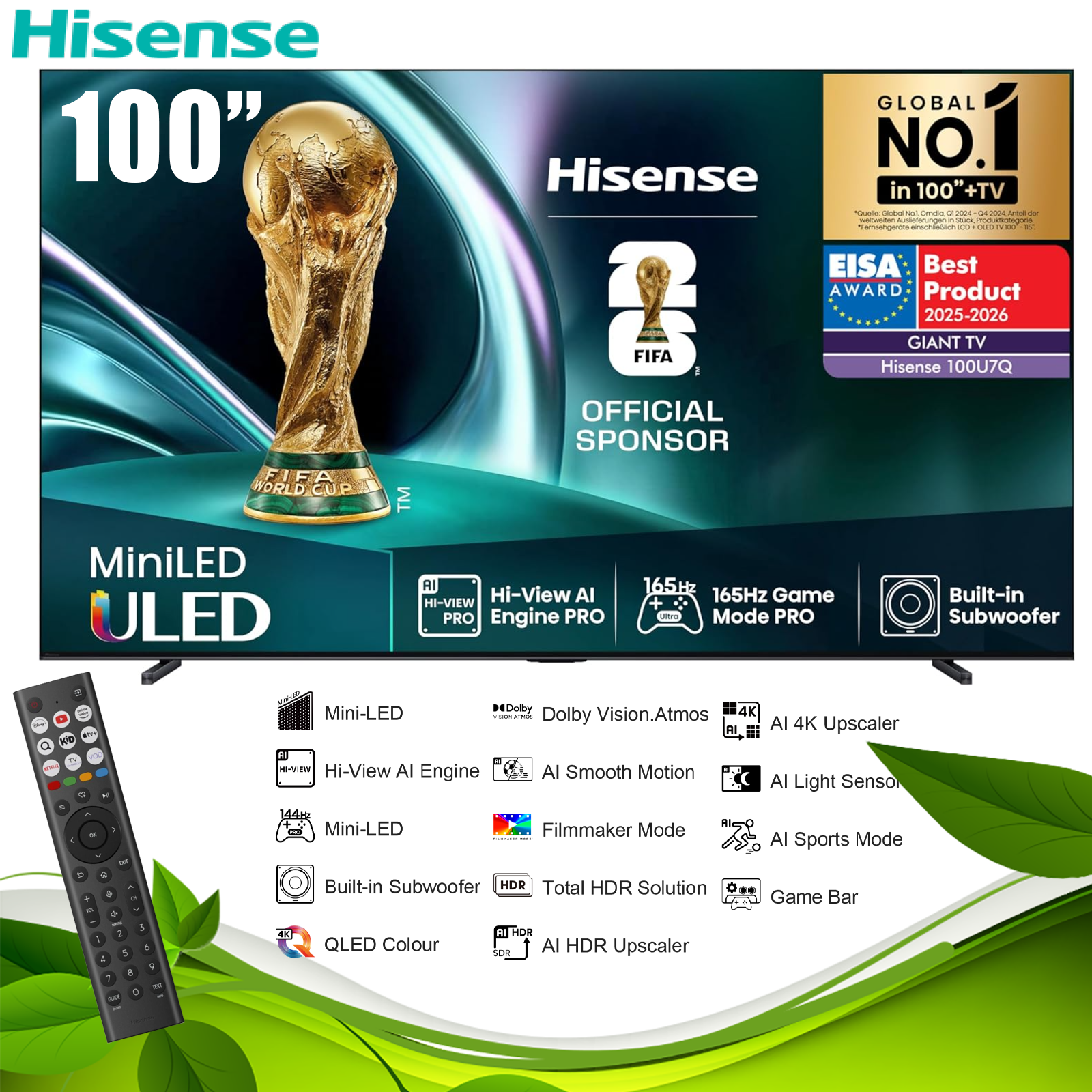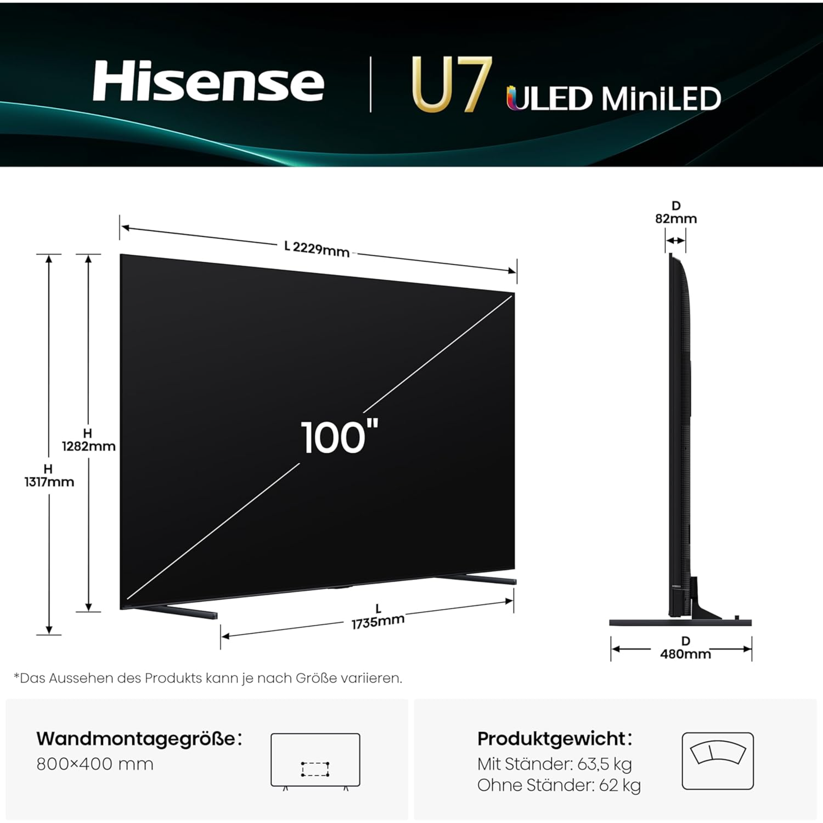Der Hisense 100U7Q richtet sich an Nutzer, die kompromisslose Bildgröße mit moderner Displaytechnologie kombinieren wollen. Mit 100 Zoll Bildschirmdiagonale und Mini LED ULED-Technologie positioniert sich dieses Modell klar im High-End-Segment für Heimkino und Gaming. Ziel ist maximale Bildkontrolle – unabhängig von Inhalt, Umgebungslicht oder Nutzungsszenario.