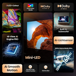 Die Mini LED ULED-Technologie kombiniert Local Dimming, Quantum Dot und die Hi-View Engine auf Basis eines Quad-Core-Prozessors. Das Ergebnis sind hohe Spitzenhelligkeit bis 1000 cd/m², tiefe Schwarztöne und ein sichtbar erweitertes Farbvolumen. Unterstützt werden alle relevanten HDR-Formate, darunter Dolby Vision IQ, das die Bildparameter in Echtzeit an das Umgebungslicht anpasst.