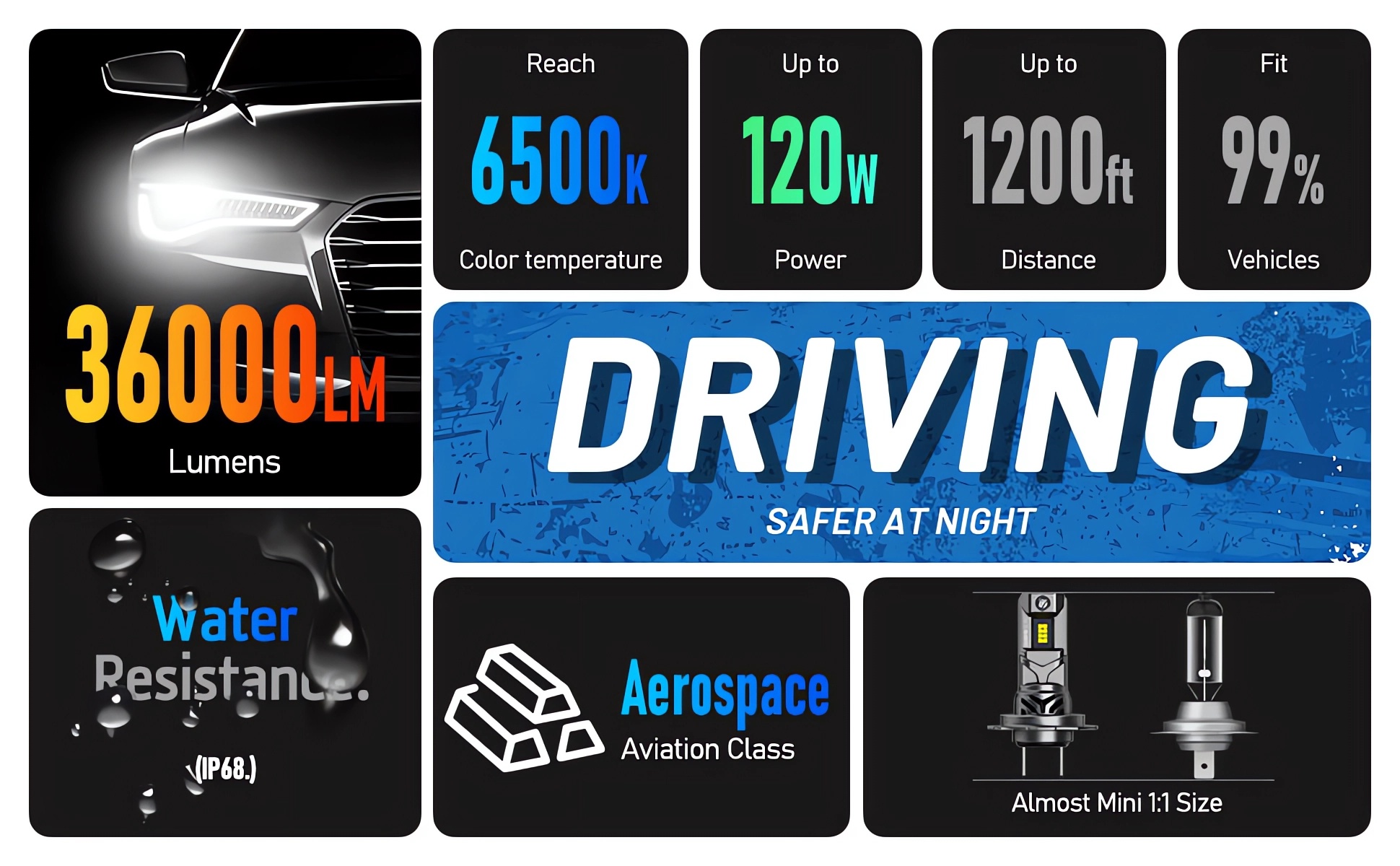 【High Brightness】Led headlight bulb adopts upgraded LED chips, providing up to 36000LM brightness, 120W per set, providing you with better visibility and improving your safety when driving at night.